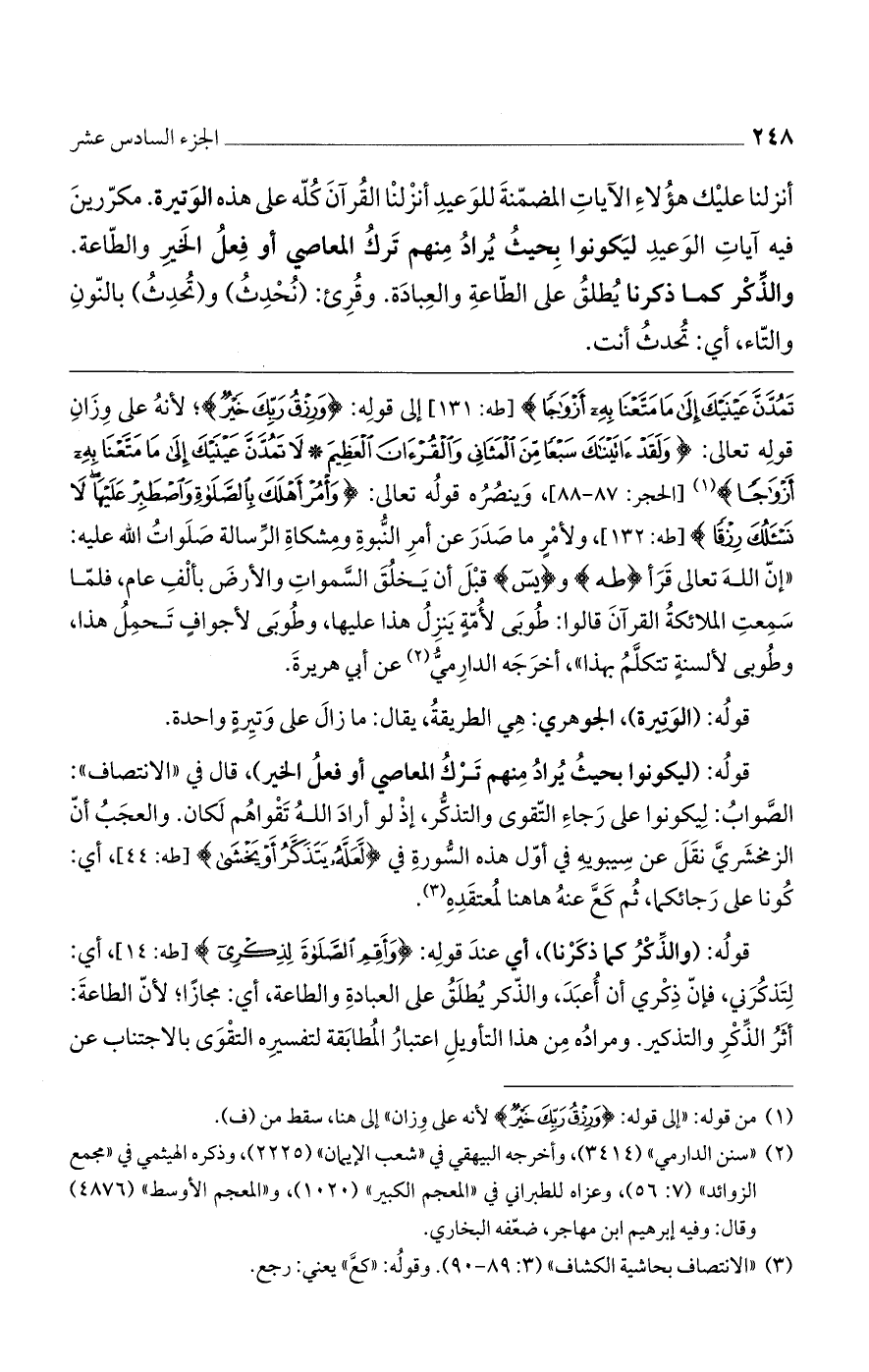 تَمُدَّنَّ عَيْنَيْكَ إِلَى مَا مَتَّعْنَا بِهِ أَزْوَاجاً) [طه: 131] إلى قوله: (وَرِزْقُ رَبِّكَ خَيْرٌ)؛ لأنه على وزان قوله تعالى: (وَلَقَدْ آتَيْنَاكَ سَبْعاً مِنْ الْمَثَانِي وَالْقُرْآنَ الْعَظِيمَ (87) لا تَمُدَّنَّ عَيْنَيْكَ إِلَى مَا مَتَّعْنَا بِهِ أَزْوَاجاً) [الحجر: 87 - 88]، وينصره قوله تعالى: (وَامُرْ أَهْلَكَ بِالصَّلاةِ وَاصْطَبِرْ عَلَيْهَا لا نَسْأَلُكَ رِزْقاً) [طه: 132]، ولأمر ما صدر عن أمر النبوة ومشكاة الرسالة صلوات الله عليه: "إن الله تعالى قرأ (طه) و (يس) قبل أن يخلُقَ السموات والأرض بألف عام، فلما سمعت الملائكة القرآن قالوا: طوبي لأمةٍ ينزلُ هذا عليها، وطوبى لأجوافٍ تحمل هذا، وطوبى لألسنةٍ تتكلمُ بهذا"، أخرجه الدارمي عن أبي هريرة.