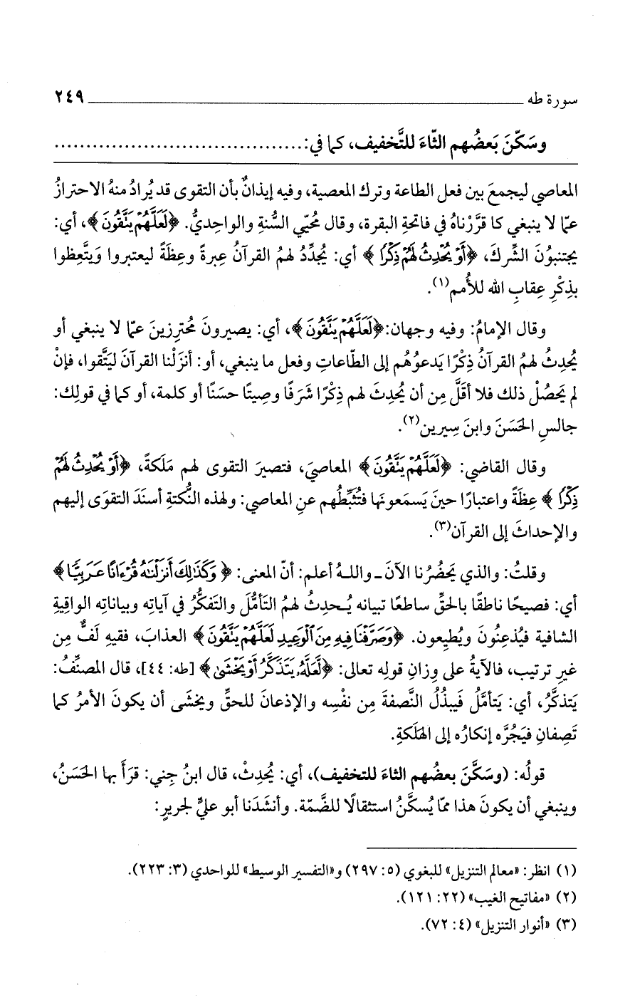 المعاصي ليجمع بين فعل الطاعة وترك المعصية، وفيه إيذانً بأن التقوى قد يُراد منه الاحترازُ عما لا ينبغي كا قررناهُ في فاتحة البقرة، وقال محيي السنة والواحدي: (لَعَلَّهُمْ يَتَّقُونَ)، أي: يجتنبون الشرك، (أَوْ يُحْدِثُ لَهُمْ ذِكْراً) أي: يُجددُ لهم القرآنُ عبرةً وعظةً ليعتبروا ويتعظوا بذكر عقاب الله للأمم.