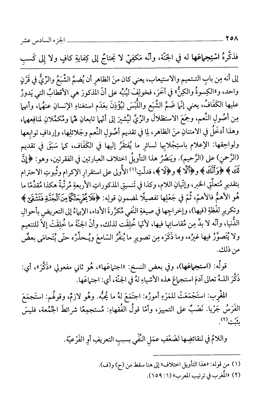 إلى أنه من باب التتميم والاستيعاب، يعني كان من الظاهر أن يُضم الشبعُ والريُّ في قرنٍ واحد، و"الكسوةُ والكِنُّ" في آخر، فخولفَ لينبه على أن المذكور هي الأقطابُ التي يدورُ عليها الكفافُ، يعني إنما ضم الشبع واللبس ليؤذن بعدم استغناء الإنسان عنهما، وأنهما من أصولِ النعم، وجمع الاستلال والري ليُشير إلى أنهما تابعان لهُما ومُكملانِ لمنافعهما، وهذا أدخل في الامتنان من الظاهر، لما في تقديم أصول النعم وجلائلها، وإرداف توابعها ولواحقها: الإعلام باستجلابها لسائر ما يُفتقرُ إليها في الكفاف، كما سبق في تقديم (الرحمن) على (الرحيم). وينصرُ هذا التأويل اختلاف العبارتين في الفقرتين، وهو: (إِنَّ لَكَ) و (وَانُكُ) و (أَلاَّ) و (لاَ)، فدلت الأولى على استقرار الإكرام وثبوت الاحترام بتقدير متعلقِ الخبر، وإتيانِ اللام، وكذا في تنسيق المذكورات الأربعة مرتبةً هكذا مُقدماً ما هو الأهمُّ فالأهمّ، ثم في جعلها تفصيلاً لمضمون قوله: (فَلا يُخْرِجَنَّكُمَا مِنْ الْجَنَّةِ فَتَشْقَى) وتكرير لفظةِ (فيها)، وإخراجها في صيغة النفي مُكررةَ الأداء، الإيماءُ إلى التعريض بأحوالِ الدنيا، وأنه لابد من مقاساتها فيها، لأنها خُلقت لذلك، وأن الجنةَ ما خُلقت إلا للتنعيم ولا يتصور فيها غيره، وما ذكره من تصوير ما يُنفر السامع ويحذره حتى يُتحامى بعضٌ من ذلك.