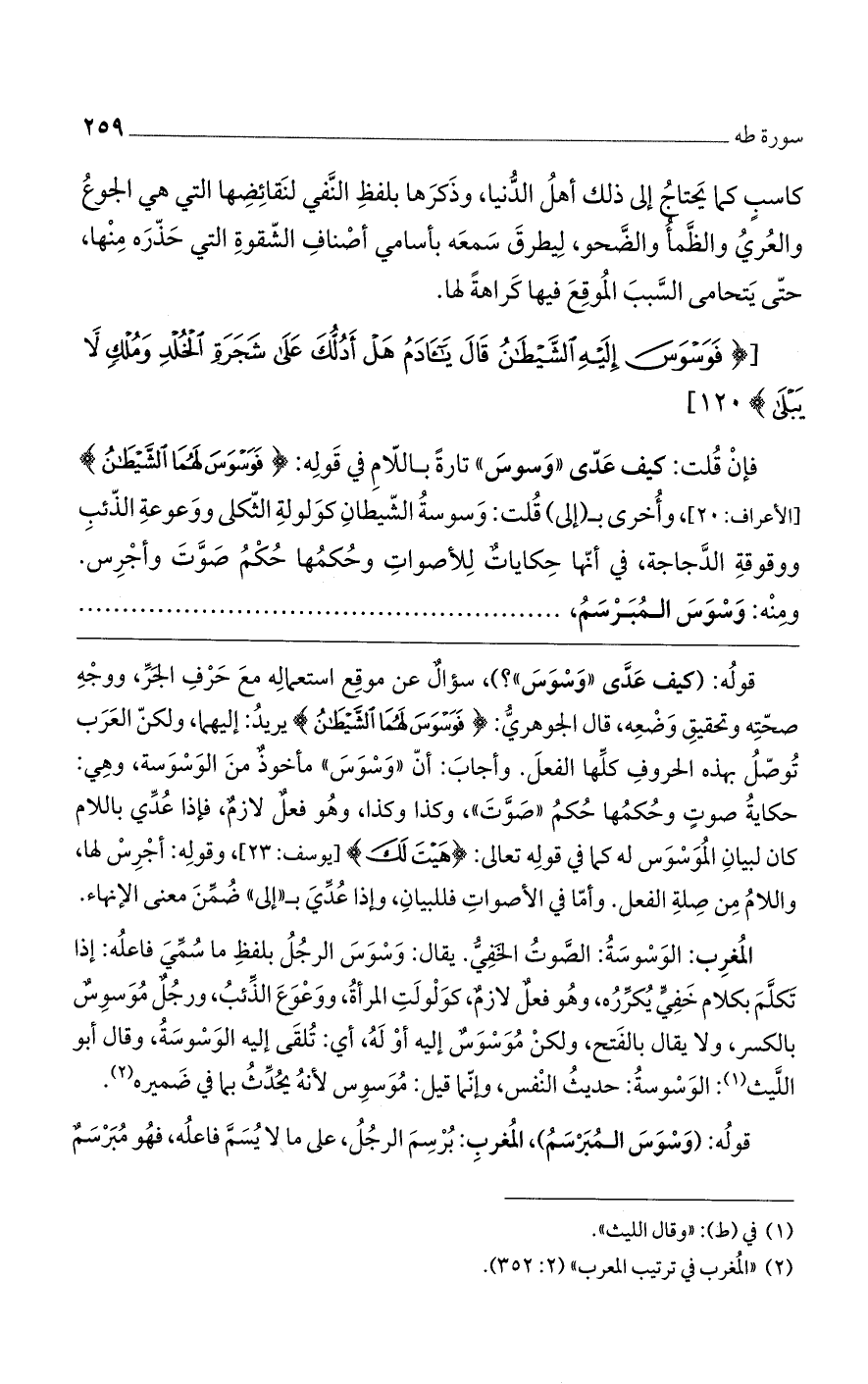قوله: (كيف عدى "وسوسَ"؟ )، سؤالٌ عن موقع استعماله مع حرفِ الجرِّ، ووجهِ صحته وتحقيق وضعه، قال الجوهري: (فَوَسْوَسَ لَهُمَا الشَّيْطَانُ) يريدُ: إليهما، ولكن العرب تُوصلُ بهذه الحروف كلها الفعل. وأجاب: أن "وسوس" مأخوذٌ من الوسوسة، وهي: حكايةُ صوتٍ وحكمها حم "صوت"، وكذا وكذا، وهو فعلٌ لازمٌ، فإذا عُدي باللام كان لبيان الموسوس له كما في قوله تعالى: (هَيْتَ لَكَ) [يوسف: 23]، وقوله: أجرس لها، واللامُ من صلة الفعل. وأما في الأصوات فللبيان، وإذا عُدي بـ"إلى" ضُمنَ معنى الإنهاء.