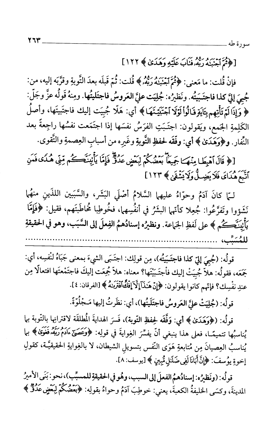 قوله: ((وَهُدًى) أي: وقفه لحفظ التوبة)، فسر الهداية المطلقة لاقترانها بالتوبة بما يناسبها تتميماً، فعلى هذا ينبغي أن يفسر الغواية في قوله: (وَعَصَى آدَمُ رَبَّهُ فَغَوَى) بما يناسب العصيان من متابعة هو النفس بتسويل الشيطان، لا بالغواية الحقيقية، كقول إخوة يوسف: (إِنَّ أَبَانَا لَفِي ضَلالٍ مُبِينٍ) [يوسف: 8].