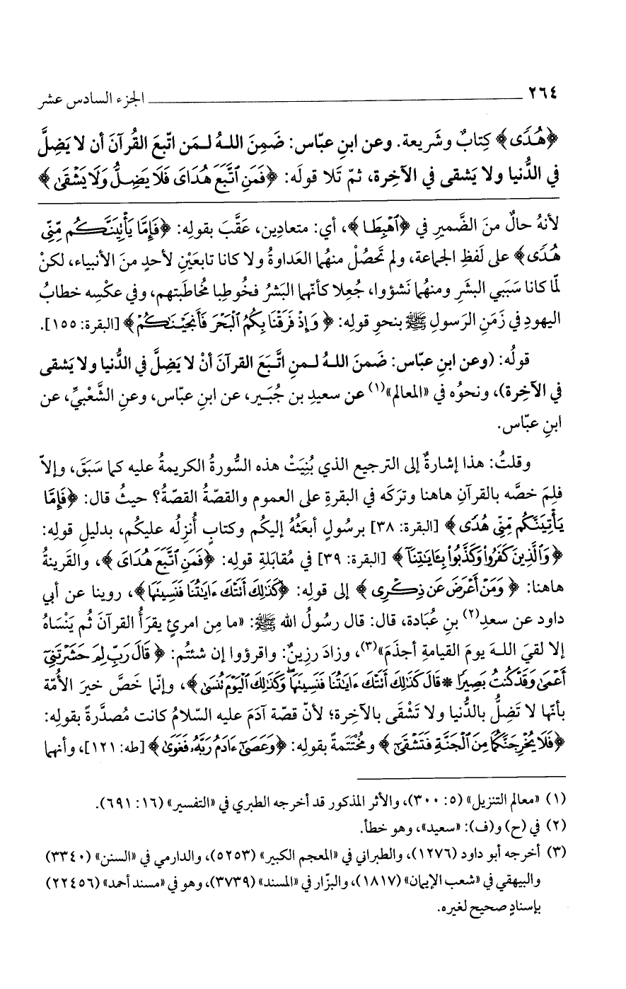 قوله: (وعن ابن عباس: ضمن الله لمن اتبع القرآن أن لا يضل في الدنيا ولا يشقى في الآخرة)، ونحوه في "المعالم" عن سعيد بن جبير، عن ابن عباس، وعن الشعبي، عن ابن عباس.