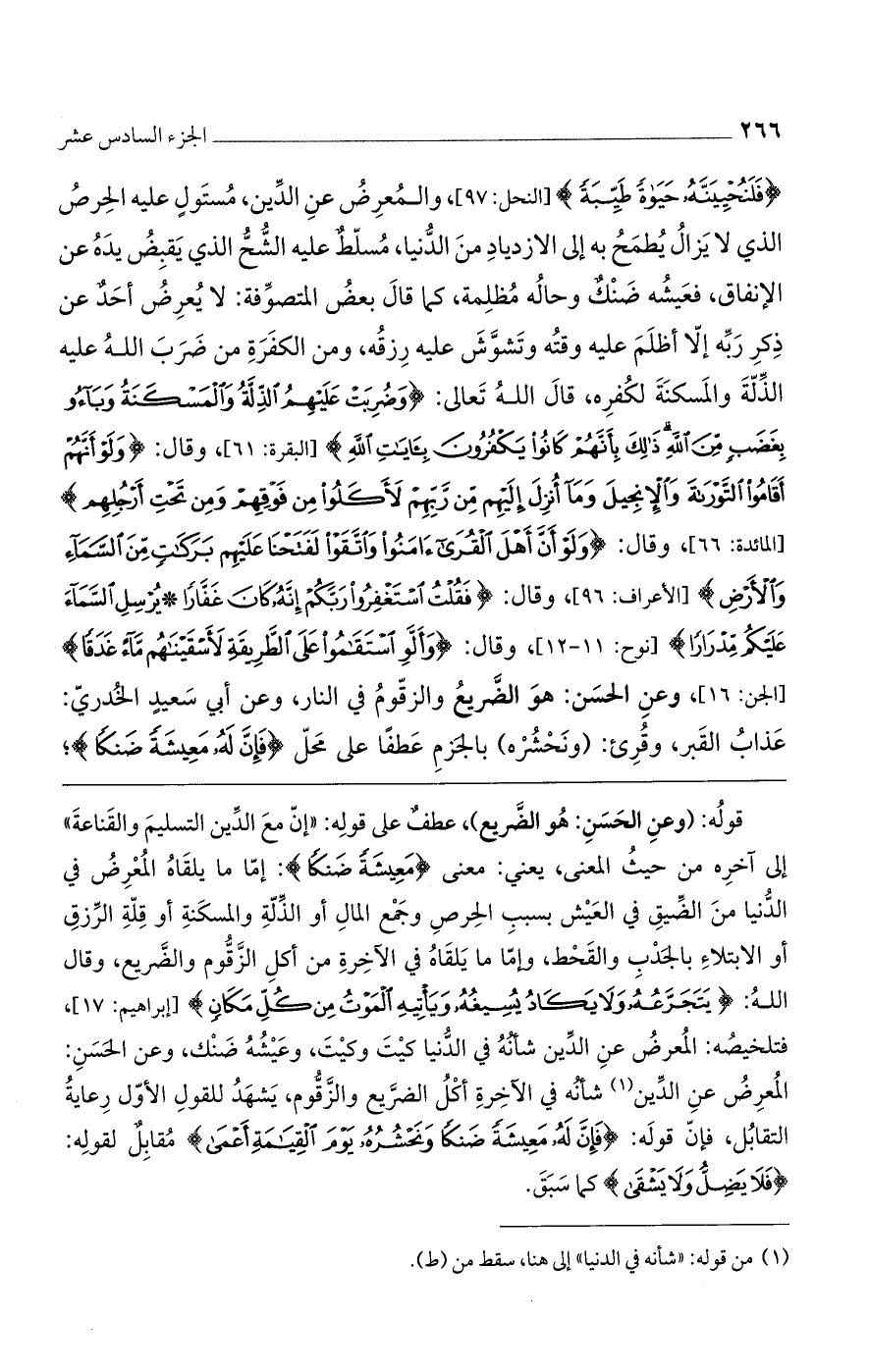 قوله: (وعن الحسنِ: هو الضريع)، عطفٌ على قوله: "إن مع الدين التسليم والقناعة" إلى آخره من حيث المعنى، يعني: معنى (مَعِيشَةً ضَنكاً): إما ما يلقاه المعرضُ في الدنيا من الضيق في العيش بسبب الحرص وجمع المال أو الذلة والمسكنة أو قلة الرزق أو الابتلاء بالجدب والقحط، وغما ما يلقاه في الآخرة من أكل الزقوم والضريع، وقال الله: (يَتَجَرَّعُهُ وَلا يَكَادُ يُسِيغُهُ وَيَاتِيهِ الْمَوْتُ مِنْ كُلِّ مَكَانٍ) [إبراهيم: 17]، فتلخيصه: المعرضُ عن الدين شأنه في الدنيا كيت وكيت، وعيشه ضنك، وعن الحسن: المُعرِضُ عن الدين شأنه في الآخرة أكلُ الضريع والزقوم، يشهدُ للقول الأول رعاية التقابل، فإن قوله: (فَإِنَّ لَهُ مَعِيشَةً ضَنكاً وَنَحْشُرُهُ يَوْمَ الْقِيَامَةِ أَعْمَى) مقابلٌ لقوله: (فَلا يَضِلُّ وَلا يَشْقَى) كما سبق.