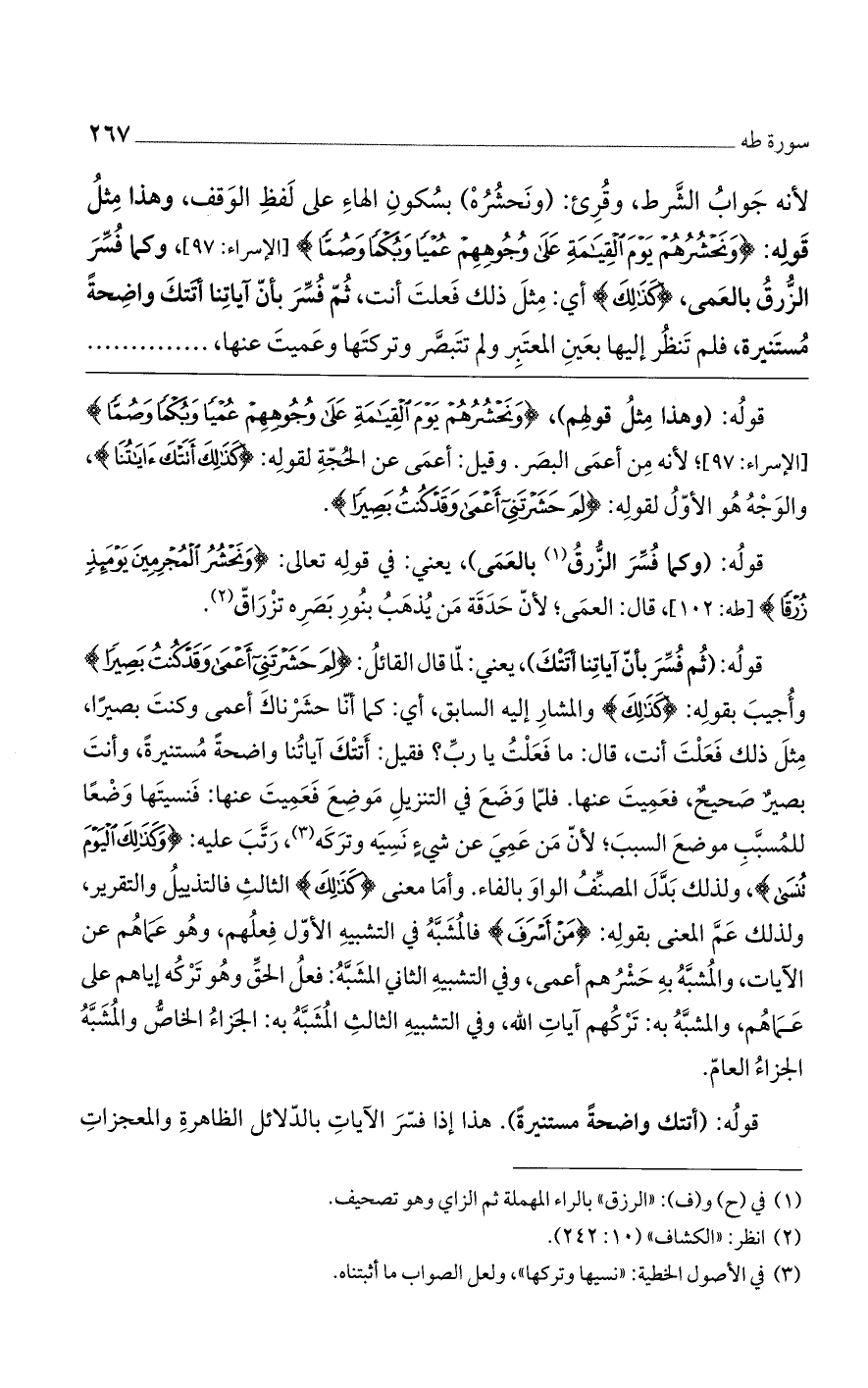 قوله: (ثم فُسر بأن آياتنا أتتك)، يعني: لما قال القائل: (لِمَ حَشَرْتَنِي أَعْمَى وَقَدْ كُنتُ بَصِيراً) وأجيب بقوله: (كَذَلِكَ) والمشار إليه السابق، أي: كما أنا حشرناك أعمى وكنت بصيراً، مثل ذلك فعلتَ أنت، قال: ما فعلتُ يا ربِّ؟ فقيل: أتتك آياتنا واضحة مستنيرةً، وأنت بصيرٌ صحيحٌ، فعميت عنها. فلما وضع في التنزيل موضع فعميت عنها: فنسيت وضعاً للمسبب موضع السبب؛ لأن من عمي عن شيء نسيه وتركه، رتب عليه: (وَكَذَلِكَ الْيَوْمَ تُنسَى)، ولذلك بدل المصنفُ الواو بالفاء. وأما معنى (َكَذَلِكَ) الثالث فالتذييلُ والتقرير، ولذلك عم المعنى بقوله: (مَنْ أَسْرَفَ) فالمشبهُ في التشبيه الأول فعلُهم، وهو عماهم عن الآيات، والمشبه به حشرهم أعمى، وفي التشبيه الثاني المشبه: فعلُ الحق وهو تركه إياهم على عماهم، والمشبه به: تركهم آيات الله، وفي التشبيه الثالث المشبه به: الجزاء الخاص والمشبه الجزاء العام.