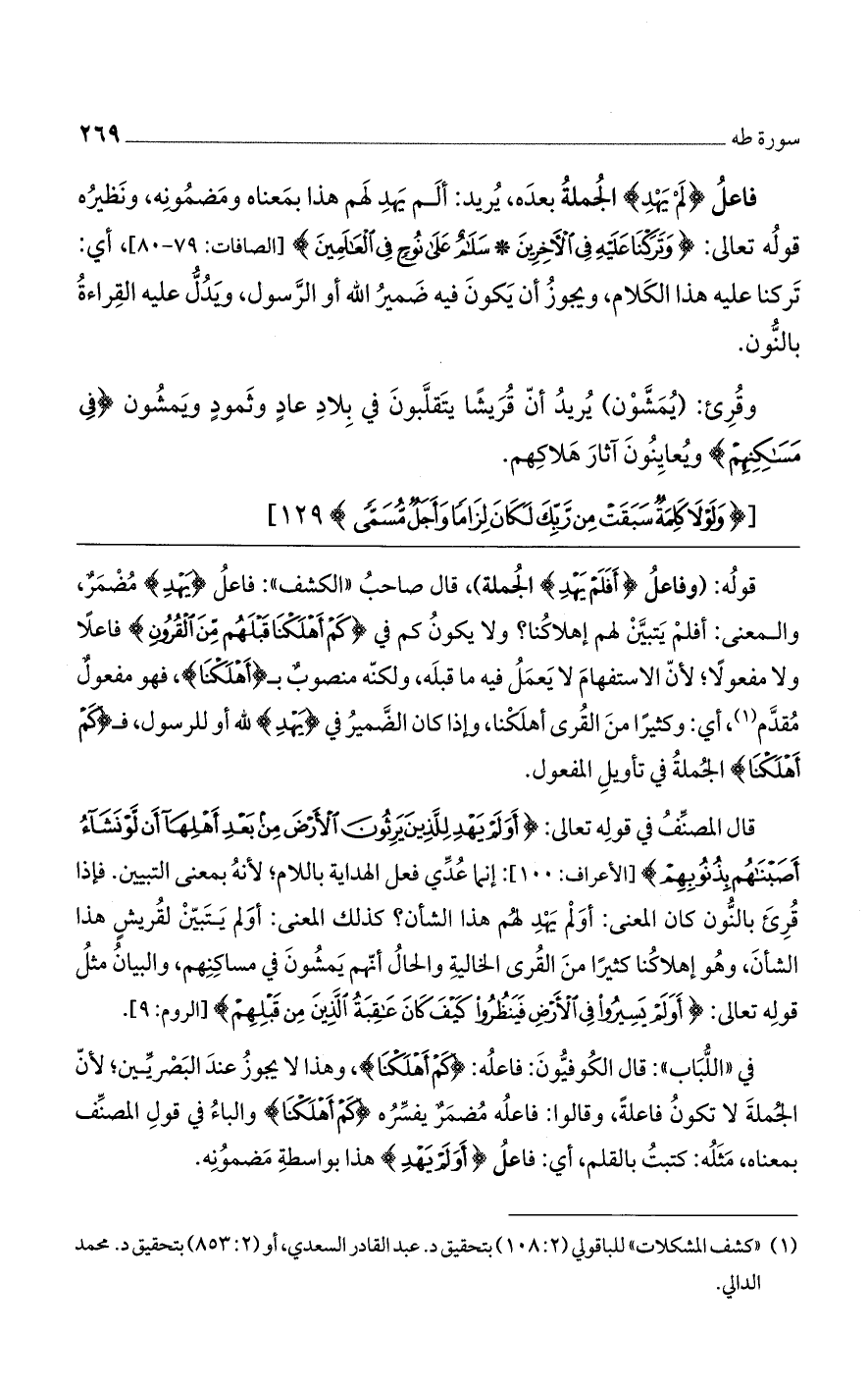 قال المصنف في قوله تعالى: (أَوَلَمْ يَهْدِ لِلَّذِينَ يَرِثُونَ الأَرْضَ مِنْ بَعْدِ أَهْلِهَا أَنْ لَوْ نَشَاءُ أَصَبْنَاهُمْ بِذُنُوبِهِمْ) [الأعراف: 100]، إنما عُدي فعل الهداية باللام؛ لأنه بمعنى التبيين. فإذا قرئ بالنون كان المعنى: أولم يهد لهم هذا الشأن؟ كذلك المعنى: أولم يتبين لقريش هذا الشأن، وهو إهلاكنا كثيراً من القرى الخالية والحالُ أنهم يمشون في مساكنهم، والبيان مثل قوله تعالى: (أَوَلَمْ يَسِيرُوا فِي الأَرْضِ فَيَنظُرُوا كَيْفَ كَانَ عَاقِبَةُ الَّذِينَ مِنْ قَبْلِهِمْ) [الروم: 9].