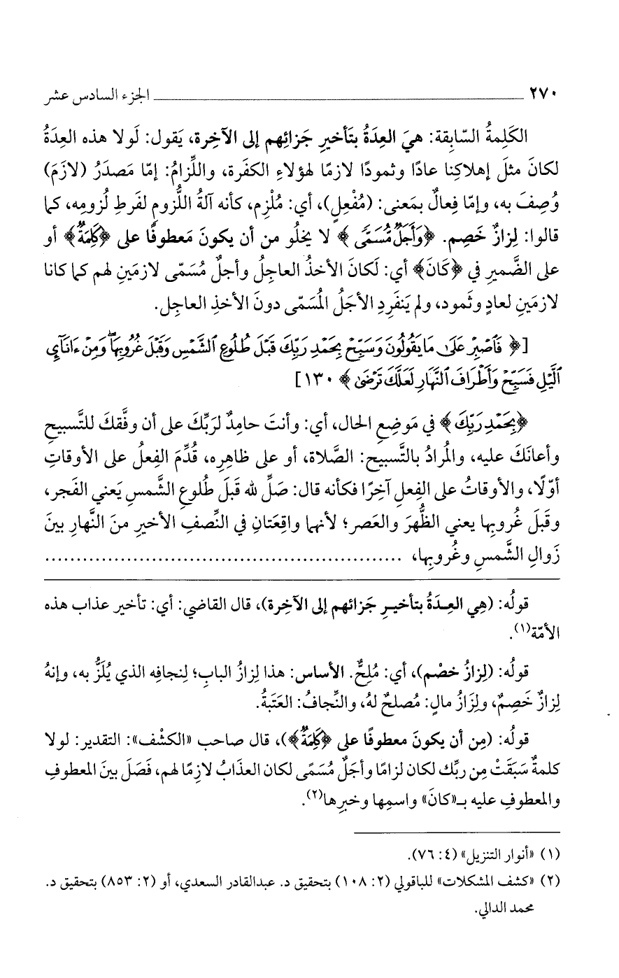 الكلمة السابقة: هي العدة بتأخير جزائهم إلى الآخرة، يقول: لولا هذه العدة لكان مثل إهلاكنا عادا وثمودا لازما لهؤلاء الكفرة. واللزام: إما مصدر (لازَمَ) وصف به، وإما فعال بمعنى (مفعل)، أى ملزم، كأنه آلة اللزوم لفرط لزومه، كما قالوا: لزاز خصم (وَأَجَلٌ مُسَمًّى) لا يخلو من أن يكون معطوفا على (كَلِمَةٌ) أو على الضمير في (كَانَ) أى لكان الأخذ العاجل وأجل مسمى لازمين لهم كما كانا لازمين لعاد وثمود، ولم ينفرد الأجل المسمى دون الأخذ العاجل. (فَاصْبِرْ عَلى ما يَقُولُونَ وَسَبِّحْ بِحَمْدِ رَبِّكَ قَبْلَ طُلُوعِ الشَّمْسِ وَقَبْلَ غُرُوبِها وَمِنْ آناءِ اللَّيْلِ فَسَبِّحْ وَأَطْرافَ النَّهارِ لَعَلَّكَ تَرْضى) [طه: 130].
