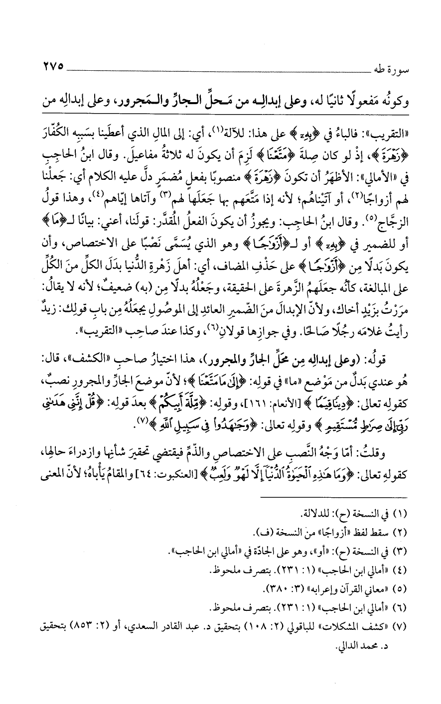 "التقريب": فالباء في (بهِ) على هذا: للآلة، أي: إلى المال الذي أعطينا بسببه الكُفار (زَهْرَةَ)، إذ لو كان صلة (مَتَّعْنَا) لزم أن يكون له ثلاثةُ مفاعيل. وقال ابن الحاجب في "الأمالي": الأظهر أن تكون (زَهْرَةَ) منصوباً بفعل مضمرٍ دل عليه الكلام أي: جعلنا لهم أزواجاً، أو آتيناهم؛ لأنه إذا متعهم بها جعلها لهم وآتاها إياهم، وهذا قولُ الزجاج. وقال ابن الحاجب: ويجوزُ أن يكون الفعلُ المقدر: قولنا، أعني: بياناً لـ (مَا) أو للضمير في (به) أو لـ (أَزْوَاجاً) وهو الذي يُسمى نصباً على الاختصاص، وان يكون بدلاً من (أَزْوَاجاً) على حذف المضاف، أي: أهل زهرة الدنيا بدل الكل من الكل على المبالغة، كأنه جعلهم الزهرة على الحقيقة، وجعلهُ بدلاً من (به) ضعيفٌ؛ لأنه لا يقالُ: مررتُ بزيدٍ أخاك، ولأن الإبدال من الضمير العائد إلى الموصول يجعله من باب قولك: زيدٌ رأيتُ غلامه رجلاً صالحاً. وفي جوازها قولانِ، وكذا عند صاحب "التقريب".