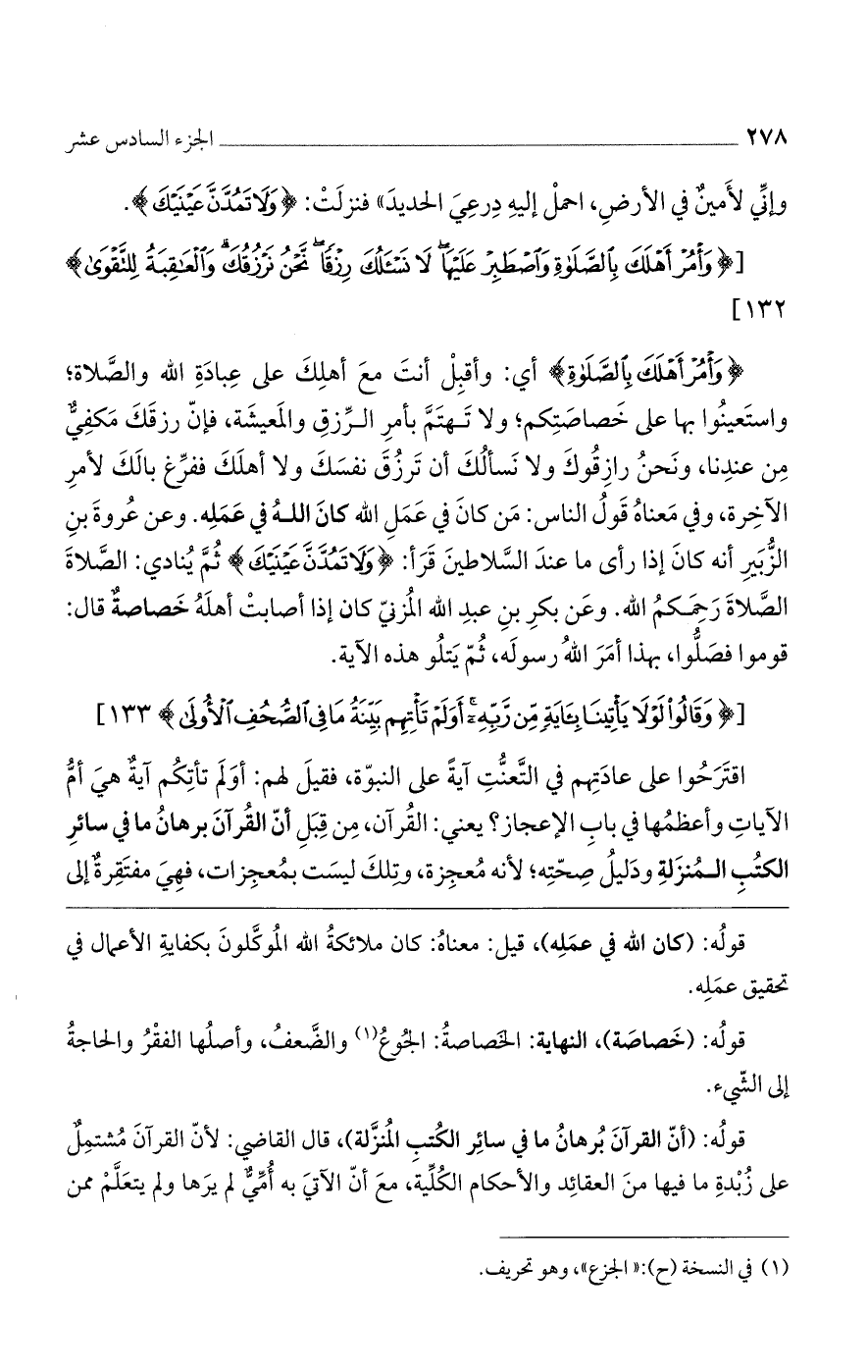 (وَامُرْ أَهْلَكَ بِالصَّلاةِ) أى وأقبل أنت مع أهلك على عبادة الله والصلاة، واستعينوا بها على خصاصتكم ولا تهتم بأمر الرزق والمعيشة، فإنّ رزقك مكفىّ من عندنا، ونحن رازقوك ولا نسألك أن ترزق نفسك ولا أهلك ففرّغ بالك لأمر الآخرة. وفي معناه قول الناس: من كان في عمل الله كان الله في عمله. وعن عروة بن الزبير أنه كان إذا رأى ما عند السلاطين قرأ (وَلا تَمُدَّنَّ عَيْنَيْكَ) ثم ينادى الصلاة الصلاة رحمكم الله. وعن بكر بن عبد الله المزني كان إذا أصابت أهله خصاصة قال: قوموا فصلوا، بهذا أمر الله رسوله، ثم يتلو هذه الآية.