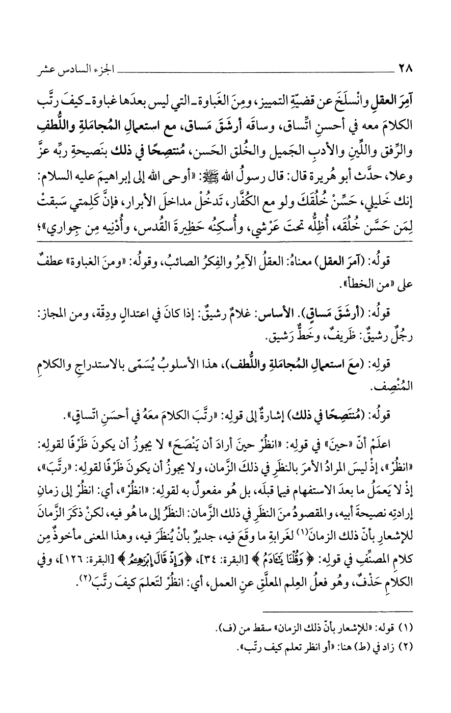 آمر العقلاء وانسلخ عن قضية التمييز، ومن الغباوة-التي ليس بعدها غباوة- كيف رتب الكلام معه في أحسن اتساق، وساقه أرشق مساق، مع استعمال المجاملة واللطف والرفق واللين والأدب الجميل والخلق الحسن، منتصحا في ذلك بنصيحة ربه عز وعلا، حدّث أبو هريرة قال: قال رسول الله صلى الله عليه وآله وسلم «أوحى الله إلى إبراهيم عليه السلام: إنك خليلي، حسن خلقك ولو مع الكفار، تدخل مداخل الأبرار،