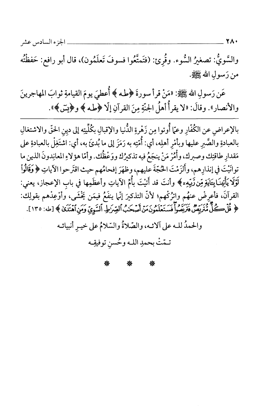 والسوي تصغير السوء. وقرئ: (فتمتعوا فسوف تعلمون). قال أبو رافع: حفظته من رسول الله صلى الله عليه وسلم. عن رسول الله صلى الله عليه وسلم «من قرأ سورة (طه) أعطى يوم القيامة ثواب المهاجرين والأنصار» وقال: «لا يقرأ أهل الجنة من القرآن إلا (طه) و (يس)» ,