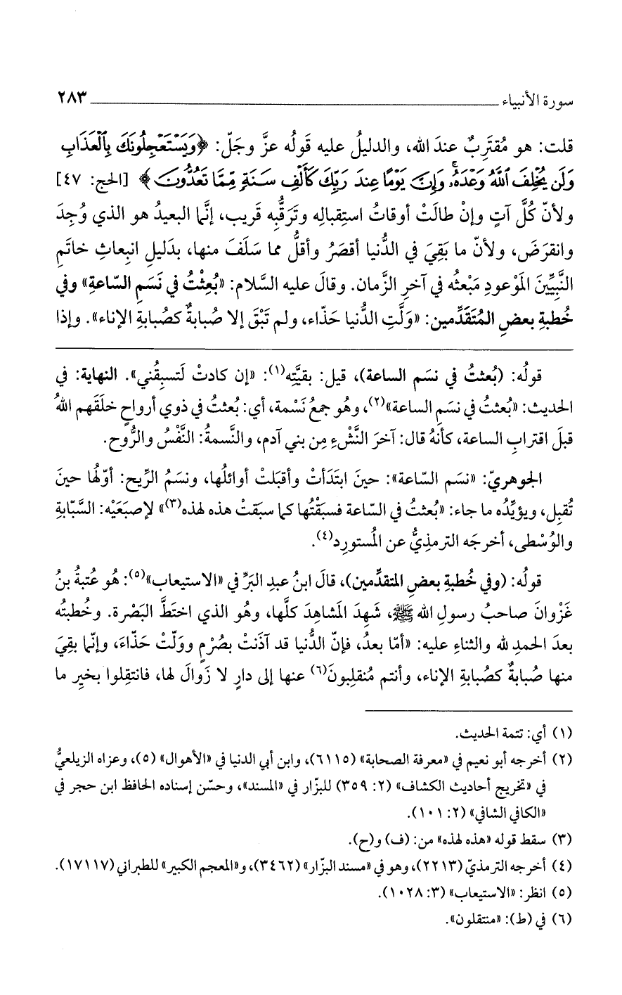 الجوهري: "نسم الساعة": حين ابتدأت وأقبلت أوائلها، ونسمُ الريح: أولها حين تُقبل، ويؤيده ما جاء: "بُعثتُ في الساعة فسبقتها كما سبقت هذه لهذه" لإصبعيه: السبابة والوسطى، أخرجه الترمذي عن المستورد.