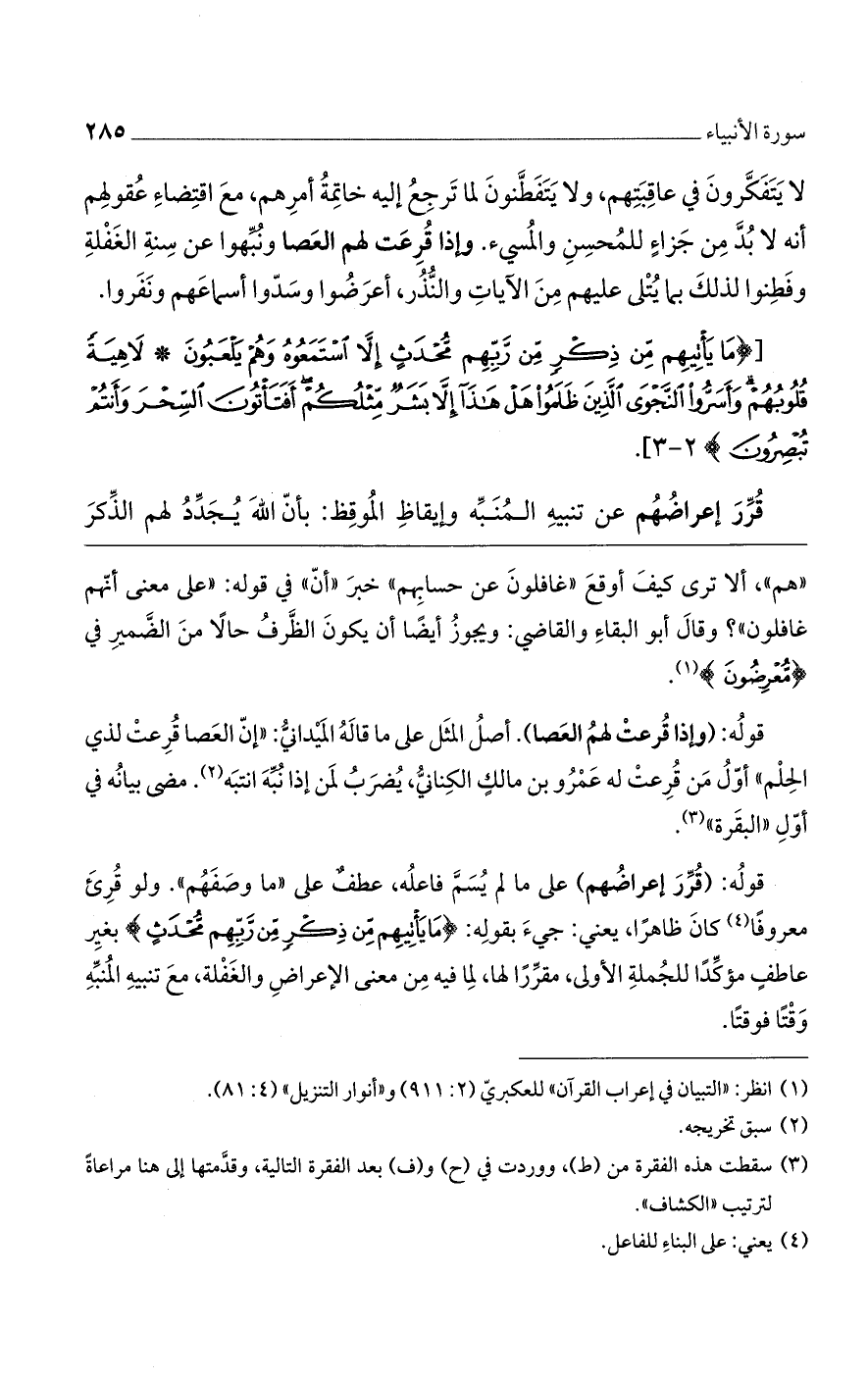 قوله: (قُرر إعراضُهم) على ما لم يُسم فاعله، عطفٌ على "ما وصفهُم". ولو قرئ معروفاً كان ظاهراص، يعني: جيء بقوله: (مَا يَاتِيهِمْ مِنْ ذِكْرٍ مِنْ رَبِّهِمْ مُحْدَثٍ) بغير عاطفٍ مؤكداً للجملة الأولى، مقرراً لها، لما فيه من معنى الإعراض والغفلة، مع تنبيه المنبه وقتاً فوقتاً.