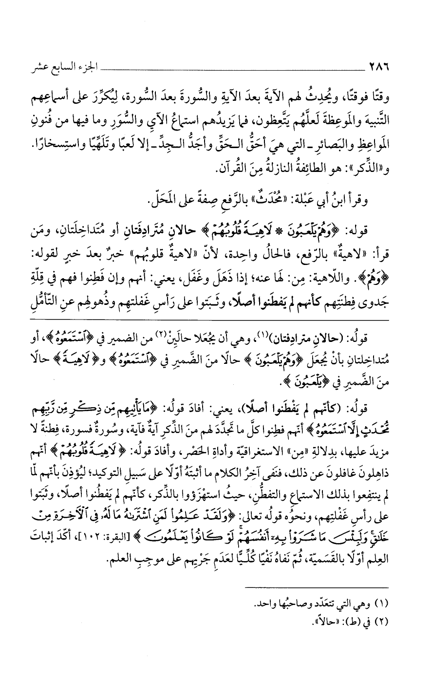 قوله: (حالان مترادفتان)، وهي أن يُجعلا حالين من الضمير في (اسْتَمَعُوهُ)، أو متداخلتان بأن يُجعل (وَهُمْ يَلْعَبُونَ) حالاً من الضمير في (اسْتَمَعُوهُ) و (لاهِيَةً) حالاً من الضمير في (يَلْعَبُونَ).