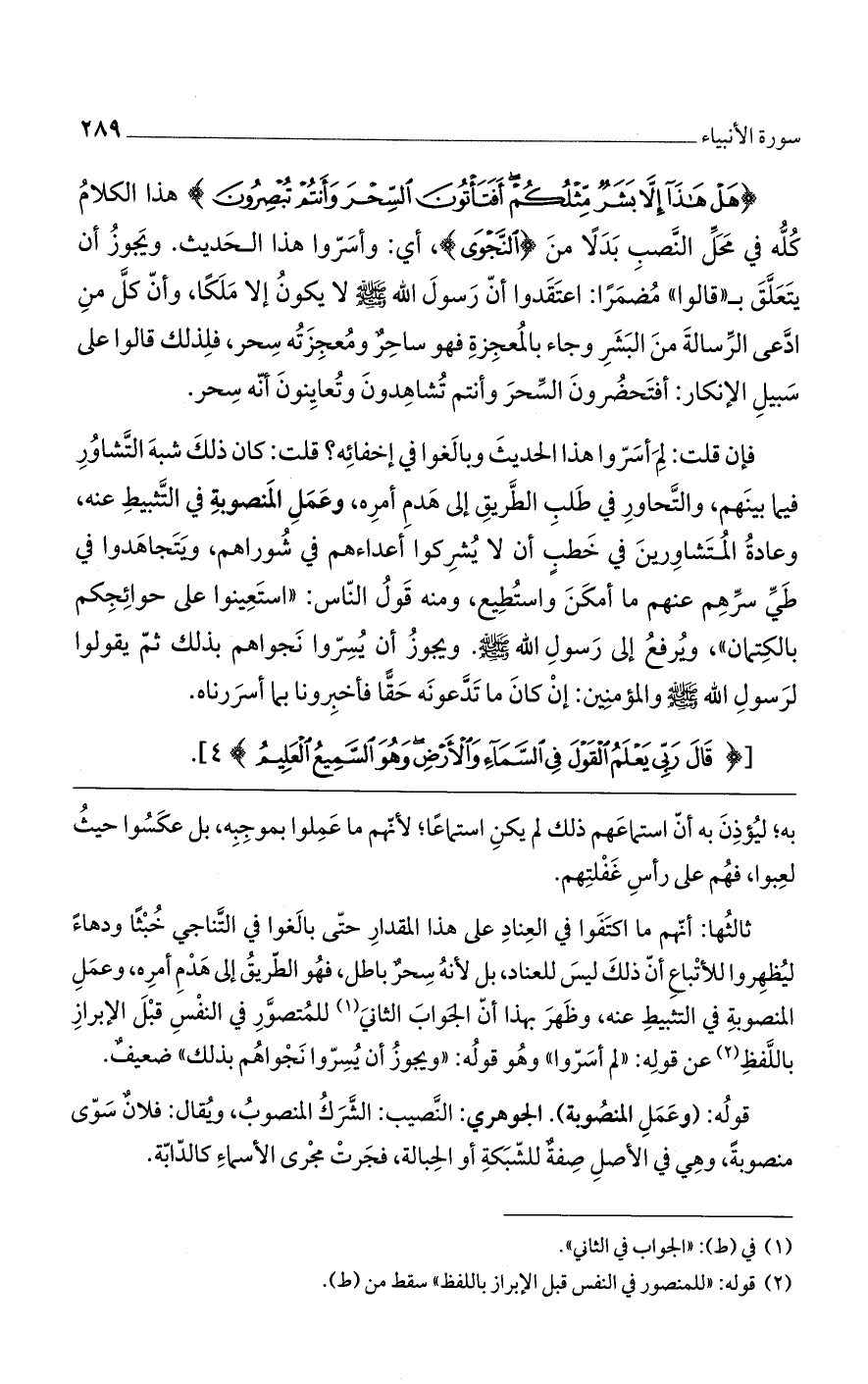 (هَلْ هذا إِلَّا بَشَرٌ مِثْلُكُمْ أَفَتَاتُونَ السِّحْرَ وَأَنْتُمْ تُبْصِرُونَ) هذا الكلام كله في محل النصب بدلا من (النجوى)، أى: وأسروا هذا الحديث. ويجوز أن يتعلق ب"قالوا" مضمرا: اعتقدوا أنّ رسول الله صلى الله عليه وسلم لا يكون إلا ملكا، وأن كل من ادّعى الرسالة من البشر وجاء بالمعجزة هو ساحر ومعجزته سحر، فلذلك قالوا على سبيل الإنكار: أفتحضرون السحر وأنتم تشاهدون وتعاينون أنه سحر.