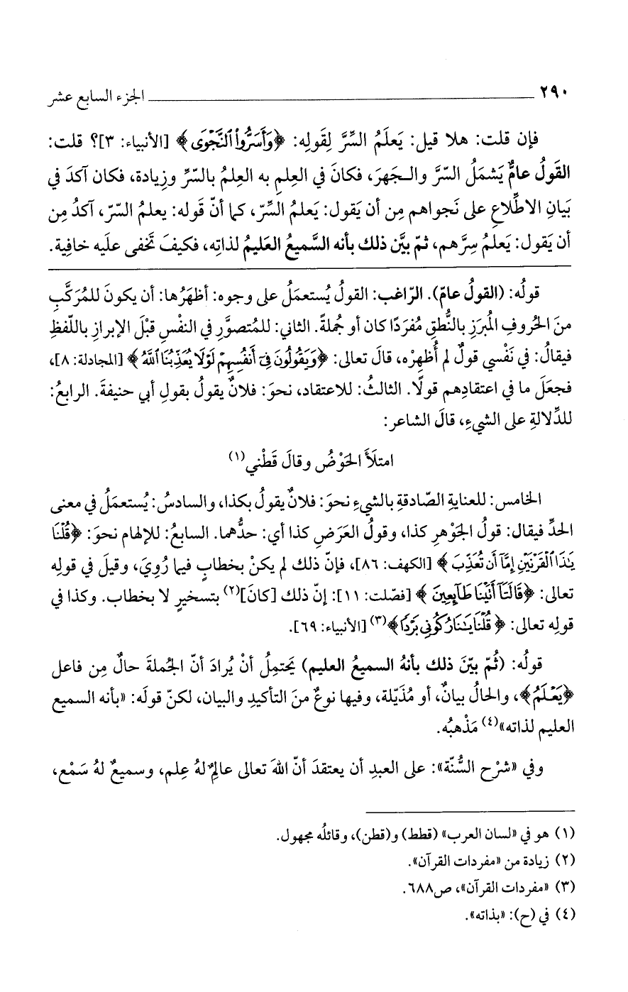 الخامس: للعناية الصادقة بالشيء نحو: فلانٌ يقول بكذا، والسادس: يستعمل في معنى الحد فيقال: قول الجوهر كذا، وقول العرض كذا أي: حدهما. السابع: للإلهام نحو: (قُلْنَا يَا ذَا الْقَرْنَيْنِ إِمَّا أَنْ تُعَذِّبَ) [الكهف: 86]، فإن ذلك لم يكن بخطاب فيما رُوي، وقيل في قوله تعالى: (قَالَتَا أَتَيْنَا طَائِعِينَ) [فصلت: 11]: إن ذلك [كان] بتسخير لا بخطاب. وكذا في قوله تعالى: (قُلْنَا يَا نَارُ كُونِي بَرْداً) [الأنبياء: 69].