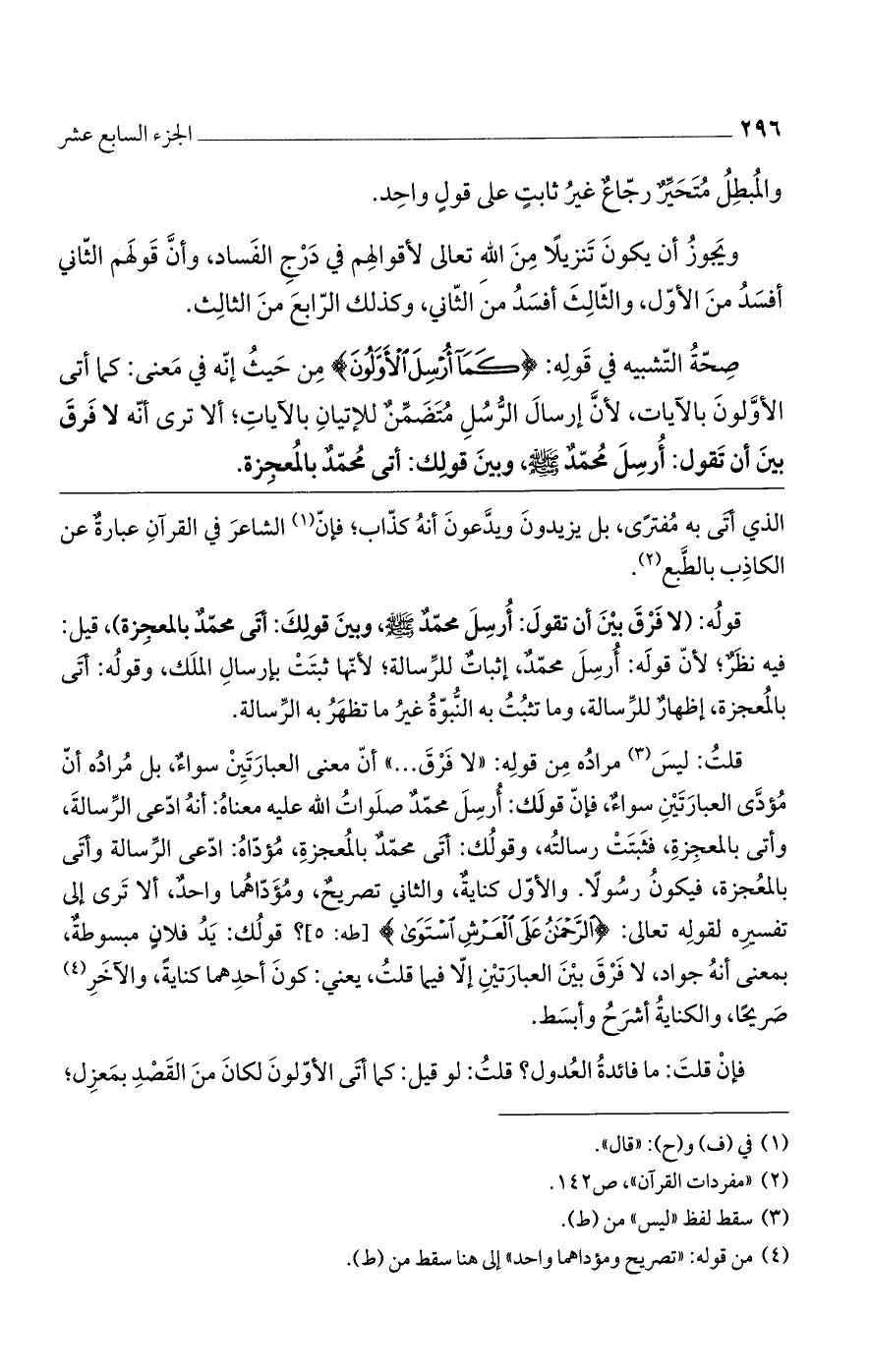 قلتُ: ليس مراده من قوله: "لا فرق ... " أن معنى العبارتين سواءٌ، بل مراده أن مؤدى العبارتين سواءٌ، فإن قولك: أُرسل محمدٌ صلواتُ الله عليه معناه: أنه ادعى الرسالة، وأتى بالمعجزة، فثبتت رسالته، وقولك: أتى محمدٌ بالمعجزة، مؤداه: ادعى الرسالة وأتى بالمعجزة، فيكون رسولاً. والأول كنايةٌ، والثاني تصريحٌ، ومؤداهما واحدٌ، ألا ترى إلى تفسيره لقوله تعالى: (الرَّحْمَنُ عَلَى الْعَرْشِ اسْتَوَى) [طه: 5]؟ قولك: يد فلانٍ مبسوطةٌ، بمعنى أنه جواد، لا فرق بين العبارتين إلا فيما قلتُ، يعني: كون أحدهما كنايةً، والآخر صريحاً، والكناية أشرح وأبسط.