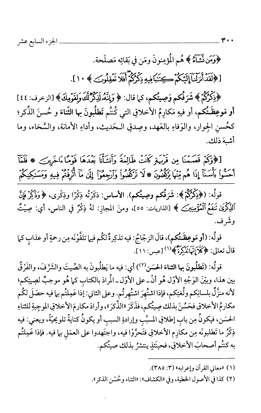 قوله: (تطلبون بها الثناء الحسن) أي: فيه ما يطلبون به الصيت والشرف، والفرق بين هذا، وبين الوجه الأول هو أن- على الأول - المراد بالكتاب كما هو موجبٌ لصيتكم؛ لأنه منزلٌ بلسانكم ولغتكم، فإذا اشتهر اشتهرتم. وعلى الثاني: إذا عملتم بما فيه حصل لكم مكارمُ الأخلاق فحسن بذلك صيتكم، فذكر "الذكر"، وأراد مكارم الأخلاق الموجبة للثناء الحسن، فيكون من باب إطلاق المسبب وإرادة السبب أو يكون كناية تلويحية، ويعني: فيه ذكر ما تطلبونه من مكارم الأخلاق فتحروا فيه، واجتهدوا على العمل بما فيه. فإذا عملتم به كنتم أصحاب الأخلاق، فحينئذ ينتشر بذلك صيتكم.