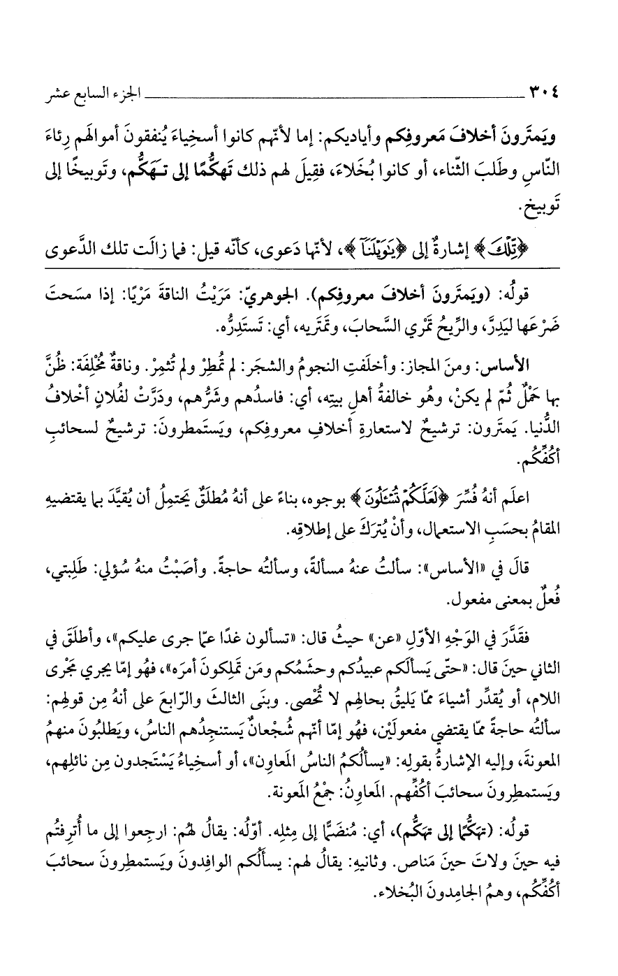 فقدر في الوجه الأول "عن" حيثُ قال "تسألون غداً عما جرى عليكم"، وأطلق في الثاني حين قال: "حتى يسألكم عبيدكم وحشمُكم ومن تملكون أمره"، فهو إما يجري مجرى اللام، أو يُقدر أشياء مما يليقُ بحالهم لا تُحصى. وبنى الثالث والرابع على أنه من قولهم: سألته حاجةً مما يقتضي مفعولين، فهو إما أنهم شجعانٌ يستنجدهم الناس، ويطلبون منهمُ المعونة، وإليه الإشارة بقوله: "يسألكم الناس المعاون"، أو أسخياء يستجدون من نائلهم، ويستمطرون سحائب أكفهم. المعاونُ: جمعُ المعونة.
