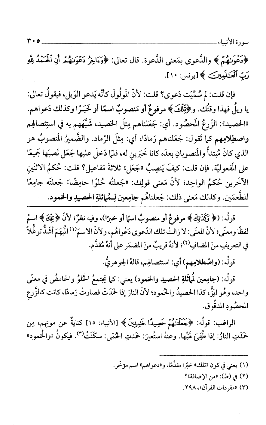فإن قلت: لم سميت دعوى؟ قلت: لأن المولول كأنه يدعو الويل، فيقول تعالى: يا ويل فهذا وقتك. و (تِلْكَ) مرفوع أو منصوب اسما أو خبرا وكذلك دعواهم. "الحصيد": الزرع المحصود، أى: جعلناهم مثل الحصيد، شبههم به في استنصالهم واصطلامهم «2» كما تقول: جعلناهم رمادا، أى مثل الرماد. والضمير المنصوب هو الذي كان مبتدأ والمنصوبان بعده كانا خبرين له، فلما دخل عليها جعل نصبها جميعا على المفعولية. فإن قلت كيف ينصب «جعل» ثلاثة مفاعيل؟ قلت: حكم الاثنين الآخرين حكم الواحد، لأنّ معنى قولك «جعلته حلوا حامضا» جعلته جامعا للطعمين. وكذلك معنى ذلك: جعلناهم جامعين لمماثلة الحصيد والخمود.
