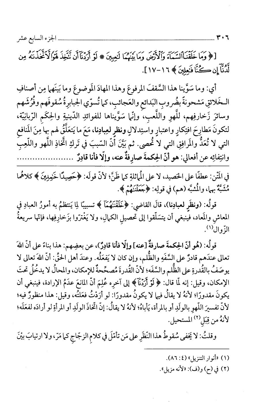 قوله: (هو أن الحكمة صارفةٌ [عنه] وإلا فأنا قادرٌ)، عن بعضهم: هذا بناء على أن الله تعالى عندهم قادرٌ على السفه والظلم، وإن كان لا يفعله. وعند أهل الحق: أن الله تعالى لا يوصف بالقدرة على الظلم والسفه، لأن القدرة مصححةٌ للإمكان، والمحالُ لا يدخلُ تحت الإمكان، وقيل: إنه لما قال: (لَوْ أَرَدْنَا) إلى آخره عُلم أن المانع عدمُ الإرادة، فينبغي أن يكون مقدوراً؛ لأنه لا يقال فيما لا يكون مقدوراً: لو أردتُ فعلته، وقيل: هذا منظورٌ فيه؛ لأن تفسير اللهو بالولد أو بالمراة، يأباه؛ لأنه لا يقال: إن اتخاذ الولد أو المرأة لو أراده لفعله؛ لأنه من قبل المستحيل.