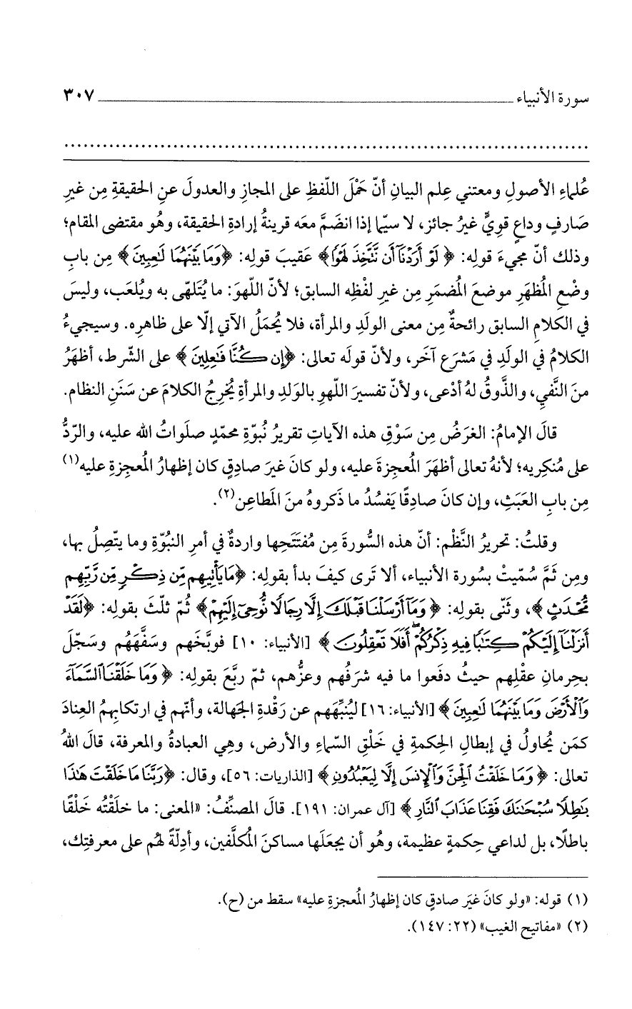 علماء الأصول ومعتني علم البيان أن حمل اللفظ على المجاز والعدول عن الحقيقة من غير صارفٍ وداعٍ قوي غير جائز، لا سيما إذا انضم معه قرينة إرادة الحقيقة، هو مقتضى المقام؛ وذلك أن مجيء قوله: (لَوْ أَرَدْنَا أَنْ نَتَّخِذَ لَهْواً) عقيب قوله: (وَمَا بَيْنَهُمَا لاعِبِينَ) من باب وضع المُظهر موضع المضمر من غير لفظه السابق؛ لأن اللهو: ما يُتلهى به ويُلعب، وليس في الكلام السابق رائحةٌ من معنى الولد والمرأة، فلا يُحمل الآتي إلا على ظاهره. وسيجيء الكلام في الولد في مشرع آخر، ولأن قوله تعالى: (إِنْ كُنَّا فَاعِلِينَ) على الشرط، أظهرُ من النفي، والذوقُ له أدعى، ولأن تفسير اللهو بالولد والمرأة يخرجُ الكلام عن سنن النظام.