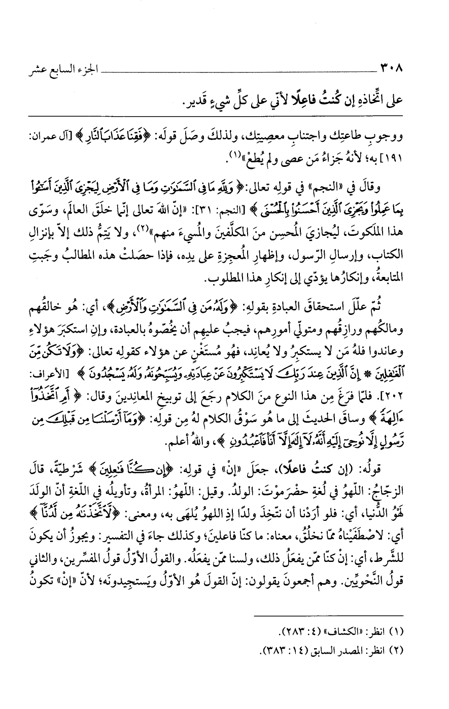 وقال في "النجم" في قوله تعالى: (وَلِلَّهِ مَا فِي السَّمَوَاتِ وَمَا فِي الأَرْضِ لِيَجْزِيَ الَّذِينَ أَسَاءُوا بِمَا عَمِلُوا وَيَجْزِيَ الَّذِينَ أَحْسَنُوا بِالْحُسْنَى) [النجم: 31]: "إن الله تعالى إنما خلق العالم، وسوى هذا الملكوت، ليُجازي المحسن من المكلفين والمسيء منهم"، ولا يتم ذلك إلا بإنزال الكتاب، وإرسال الرسول، وإظهار المعجزة على يده، فإذا حصلت هذه المطالب وجبت المتابعة، وإنكارها يؤدي إلى إنكار هذا المطلوب.