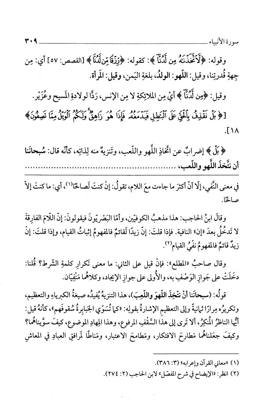 قوله: (سبحاننا أن نتخذ اللهو واللعب)، هذا التنزيه يفيده صيغةُ الكبرياء والتعظيم، وتكريره مراراً ثمانية وإلى التعظيم الإشارةُ بقوله: "كما تُسوي الجبابرةُ سُقوفهم"، كأنه قيل: أيها الناظرُ المنكرُ، ألا ترى إلى هذا السقف المرفوع، وهذا المهاد الموضوع، كيف سويناهما؟ وكيف جعلناهما مطارح الافتكار، ومطامح الاعتبار، ومناطاً لمرافق العباد في المعاش