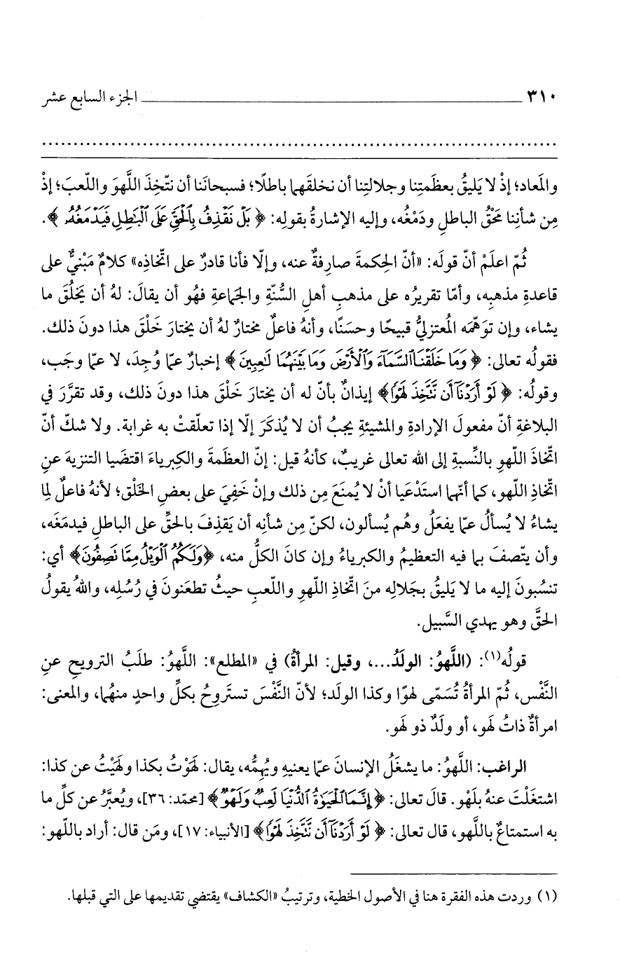 ثُم اعلمْ أن قوله: "أن الحكمةَ صارفةُ عنه، وإلا فانا قادرٌ على اتخاذه" كلامٌ مبنيٌّ على قاعدة مذهبه، وأما تقريره على مذهب أهل السنة والجماعة فهو أن يقال: له أنيخلق ما يشاء، وإن توهمه المعتزلي قبيحاً وحسناً، وأنه فاعلٌ مختارٌ له أن يختار خلق هذا دون ذلك. فقوله تعالى: (وَمَا خَلَقْنَا السَّمَاءَ وَالأَرْضَ وَمَا بَيْنَهُمَا لاعِبِينَ) إخبارٌ عما وُجِدَ، لا عما وجب، وقوله: (لَوْ أَرَدْنَا أَنْ نَتَّخِذَ لَهْواً) إيذانٌ بأن له أن يختار خلق هذا دون ذلك، وقد تقرر في البلاغة أن مفعول الإرادة والمشيئة يجب أن لا يُذكر إلا إذا تعلقت به غرابة. ولا شك أن اتخاذ اللهو بالنسبة إلى الله تعالى غريب، كأنه قيل: إن العظمة والكبرياء اقتضيا التنزيه عن اتخاذ اللهو، كما أنهما استدعيا أن لا يُمنع من ذلك وإن خفي على بعض الخلق؛ لأنه فاعلٌ لما يشاء لا يسأل عما يفعلُ وهم يسألون، لكن من شأنه أن يقذف بالحق على الباطل فيدمغه، وأن يتصف بما فيه التعظيم والكبرياء وإن كان الكل منه، (وَلَكُمْ الْوَيْلُ مِمَّا تَصِفُونَ) أي: تنسُبون إيه ما لا يليقُ بجلاله من اتخاذ اللهو واللعب حيثُ تطعنون في رسله، والله يقول الحق وهو يهدي السبيل.