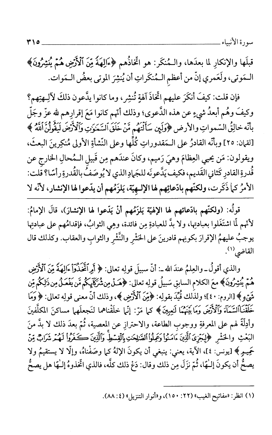 والذي أقولُ - والعلمُ عند الله-: أن سبيل قوله تعالى: (أَمْ اتَّخَذُوا آلِهَةً مِنْ الأَرْضِ هُمْ يُنشِرُونَ) مع الكلام السابق سبيل قوله تعالى: (هَلْ مِنْ شُرَكَائِكُمْ مَنْ يَفْعَلُ مِنْ ذَلِكُمْ مِنْ شَيْءٍ) [الروم: 40]؛ ولذلك قُيد بقوله: (مِنْ الأَرْضِ)، وذلك أن معنى قوله تعالى: (وَمَا خَلَقْنَا السَّمَاءَ وَالأَرْضَ وَمَا بَيْنَهُمَا لاعِبِينَ) كما مر: إنما خلقناهما لنجعلهما مساكن المكلفين وأدلةً لهم على المعرفة ووجوب الطاعة، والاحتراز عن المعصية، ثم بعد ذلك لابد من البعث والحشر (لِيَجْزِيَ الَّذِينَ آمَنُوا وَعَمِلُوا الصَّالِحَاتِ بِالْقِسْطِ وَالَّذِينَ كَفَرُوا لَهُمْ شَرَابٌ مِنْ حَمِيمٍ) [يونس: 4]، الآية، يعني: ينبغي أن يكون الإله كما وصفناه، وألا لا يستقيم ولا يصح أن يكون إلهاً، ثم نزل من ذلك، وقال: دع ذلك كله، فالذي اتخذوه إلها هل يصح
