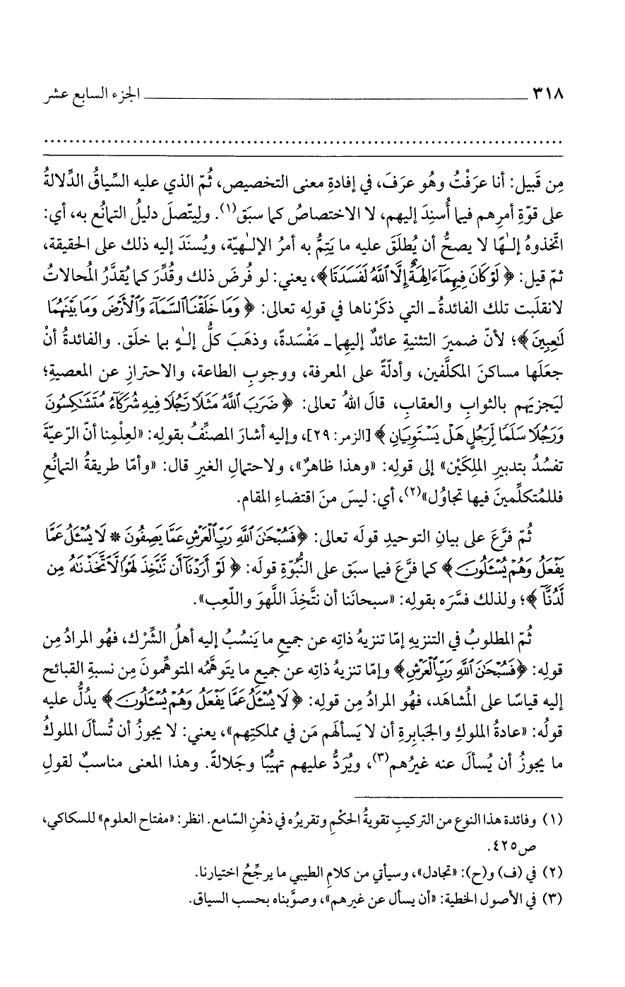 ثم المطلوبُ في التنزيه إما تنزيهُ ذاته عن جميع ما ينسبُ غليه أهلُ الشرك، فهو المراد من قوله: (فَسُبْحَانَ اللَّهِ رَبِّ الْعَرْشِ) وإما تنزيه ذاته عن جميع ما يتوهمه المتوهمون من نسبة القبائح إليه قياساً على المشاهد، فهو المراد من قوله: (لا يُسْأَلُ عَمَّا يَفْعَلُ وَهُمْ يُسْأَلُونَ) يدل عليه قوله: "عادةُ الملوك والجبابرة أن لا يسألهم من في مملكتهم"، يعني: لا يجو أن تُسأل الملوك ما يجوز ان يُسأل عنه غيرهم، ويرد عليهم تهيباً وجلالةً. وهذا المعنى مناسبٌ لقول