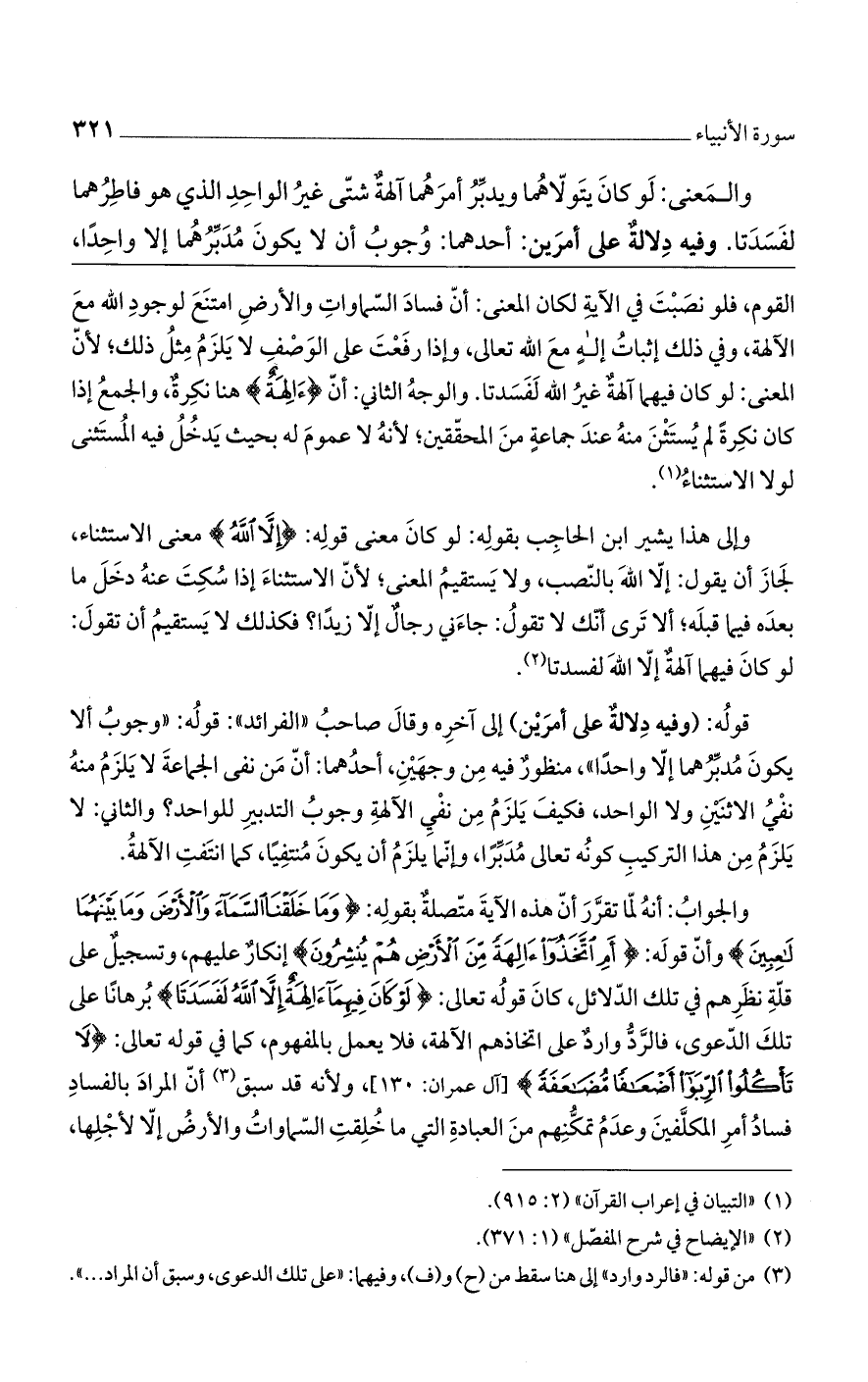 قوله: (وفيه دلالة على أمرين) إلى آخره وقال صاحب "الفرائد": قوله: "وجوب ألا يكون مدبرهما إلا واحداً"، منظورٌ فيه من وجهين، أحدهما: أن من نفي الجماعة لا يلزم منه نفي الاثنين ولا الواحد، فكيف يلزم من نفي الآلهة وجوب التدبير للواحد؟ والثاني: لا يلزم من هذا التركيب كونه تعالى مدبراً، وإنما يلزم أن يكون منتفياً، كما انتفت الآلهة.