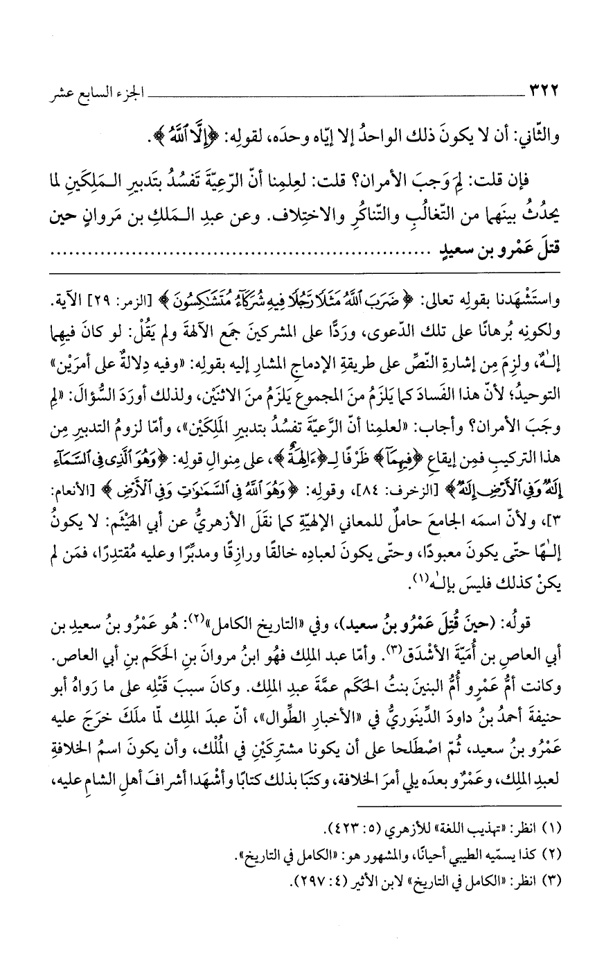 واستشهدنا بقوله تعالى: (ضَرَبَ اللَّهُ مَثَلاً رَجُلاً فِيهِ شُرَكَاءُ مُتَشَاكِسُونَ) [الزمر: 29] الآية. ولكونه بُرهاناً على تلك الدعوى، ورداً على المشركين جمع الآلهة ولم يقل: لو كان فيهما إلهٌ، ولزم من إشارة النص على طريقة الإدماج المشار إليه بقوله: "وفيه دلالةٌ على أمرين" التوحيدُ؛ لان هذا الفساد كما يلزمُ من المجموع يلزمُ من الاثنين، ولذلك أورد السؤال: "لِم وجب الأمران وأجاب: "لعلمنا أن الرعية تفسدُ بتدبير الملكين"ن وأما لزوم التدبير من هذا التركيب فمن إيقاع (فِيهِمَا) ظرفاً لـ (آلِهَةً)، على منوال قوله: (هُوَ الَّذِي فِي السَّمَاءِ إِلَهٌ وَفِي الأَرْضِ إِلَهٌ) [الزخرف: 84]، وقوله: (وَهُوَ اللَّهُ فِي السَّمَوَاتِ وَفِي الأَرْضِ) [الأنعام: 3]، ولأن اسمه الجامع حاملٌ للمعاني الإلهية كما نقل الأزهري عن أبي الهيثم: لا يكونُ إلها حتى يكون معبوداً، وحتى يكون لعباده خالقاً ورازقاً ومدبراً وعليه مقتدراً، فمن لم يكن كذلك فليس بإله.