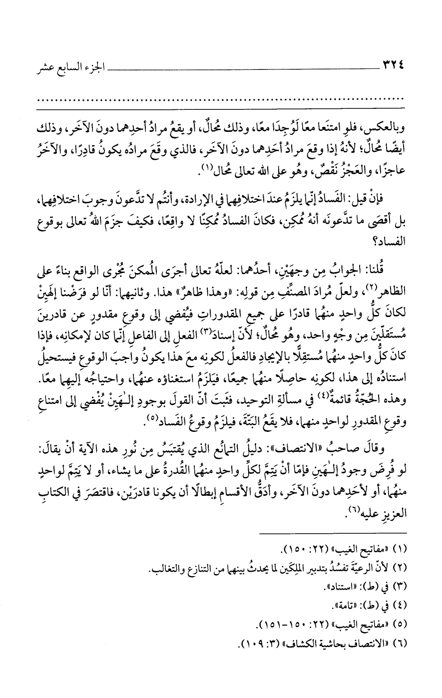 قُلنا: الجواب من وجهين، أحدهما: لعله تعالى أجرى الممكن مُجرى الواقع بناءً على الظاهر، ولعل مراد المصنف من قوله: "وهذا ظاهرٌ" هذا. وثانيهما: أنا لو فرضنا إلهين لكان كل واحدٍ منهما قادرً على جميع المقدورات فيفضي إلى وقوع مقدور عن قادرين مستقلين من وجه واحد، وهو محالٌ؛ لأن إسناد الفعل إلى الفاعل إنما كان لإمكانه، فإذا كان كل واحدٍ منهما مستقلاً بالإيجاد فالفعلُ لكونه مع هذا يكون واجب الوقوع فيستحيلُ استناده إلى هذا، لكونه حاصلاً منهما جميعاً، فيلزم استغناؤه عنهما، احتياجه إليهما معاً. وهذه الحجةُ قائمةٌ في مسألة التوحيد، فثبت أن القول بوجود إلهين يُفضي إلى امتناع وقوع المقدور لواحدٍ منهما، فلا يقع البتة، فيلزمُ وقوعُ الفساد.
