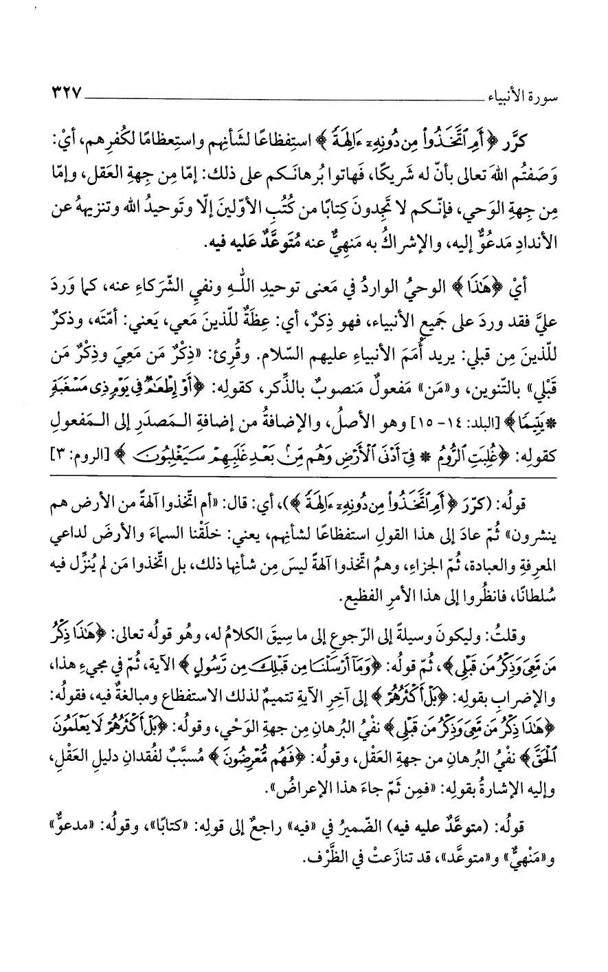 كرّر (أَمِ اتَّخَذُوا مِنْ دُونِهِ آلِهَةً) استفظاعا لشأنهم واستعظاما لكفرهم، أى: وصفتم الله تعالى بأنّ له شريكا، فهاتوا برهانكم على ذلك: إمّا من جهة العقل، وإمّا من جهة الوحى، فإنكم لا تجدون كتابا من كتب الأوّلين إلا وتوحيد الله وتنزيهه عن الأنداد مدعوّ إليه، والإشراك به منهى عنه متوعد عليه.