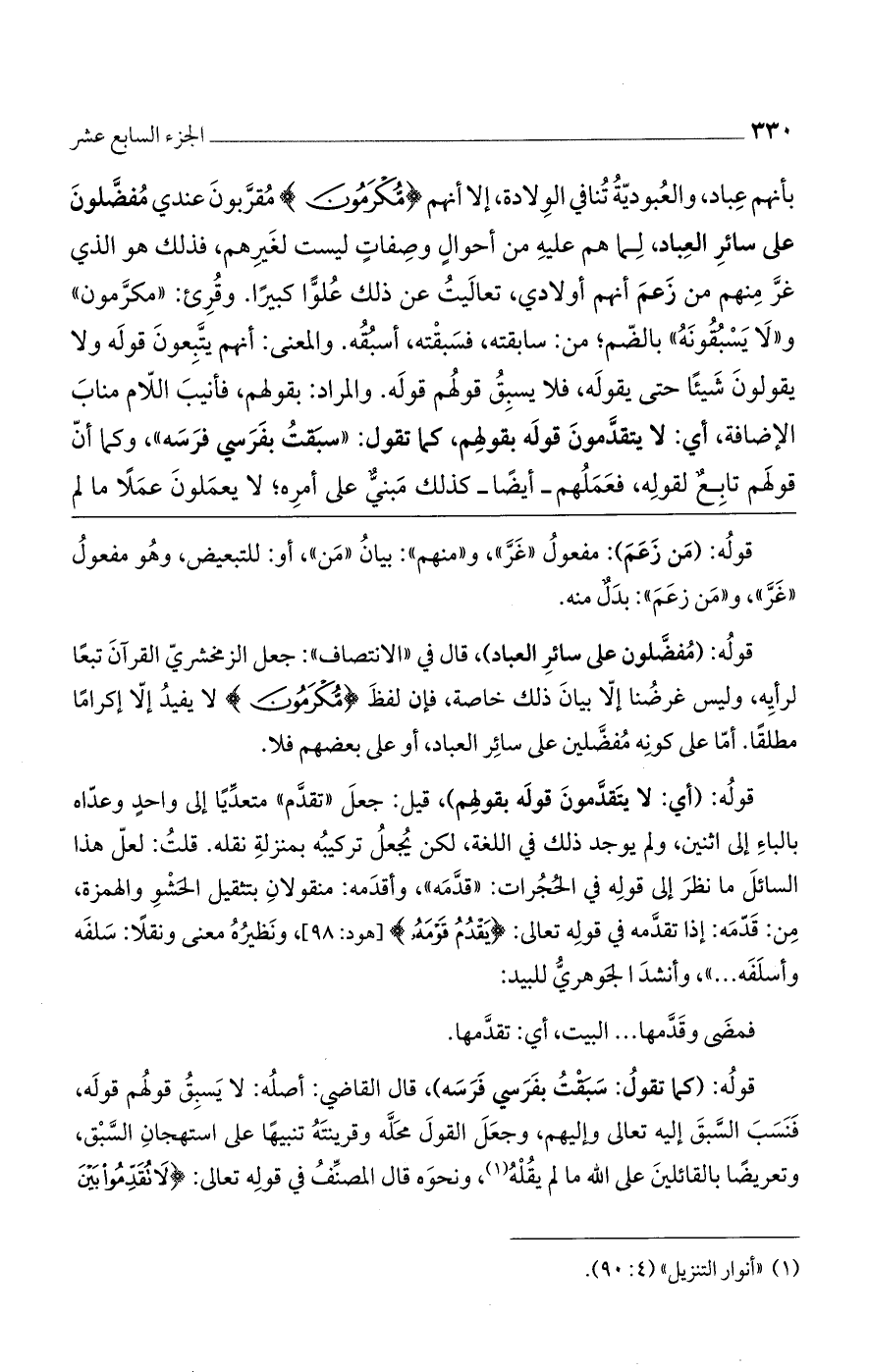 قوله: (مُفضلون على سائر العباد)، قال في "الانتصاف": جعل الزمخشري القرآن تبعاً لرأيه، وليس غرضُنا إلا بيان ذلك خاصة، فإن لفظ (مُكْرَمُونَ) لا يفيدُ إلا إكراماً مطلقاً. أما على كونه مفضلين على سائر العباد، أو على بعضهم فلا.