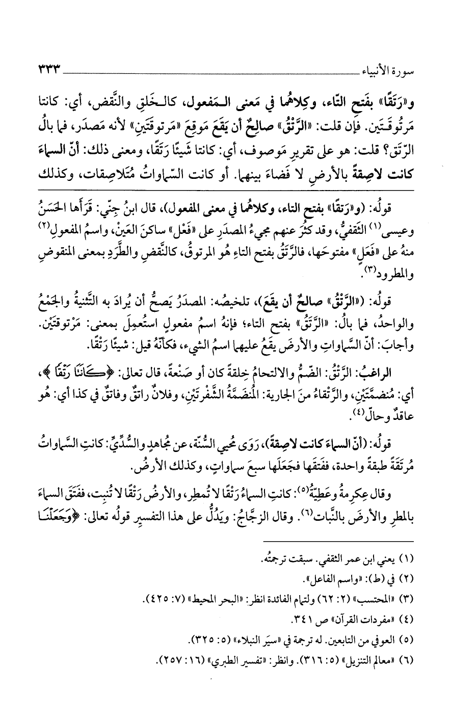 قوله: (و"رتقاً" بفتح التاء، وكلاهما في معنى المفعول)، قال ابن جني: قراها الحسنُ وعيسى الثقفيُّ، وقد كثُرَ عنهم مجيءُ المصدر على "فعل" ساكن العين، واسمُ المفعولِ منه على "فعلٍ" مفتوحها، فالرتق بفتح التاء هوالمرتوقُ، كالنقض والطرد بمعنى المنقوض والمطرود.