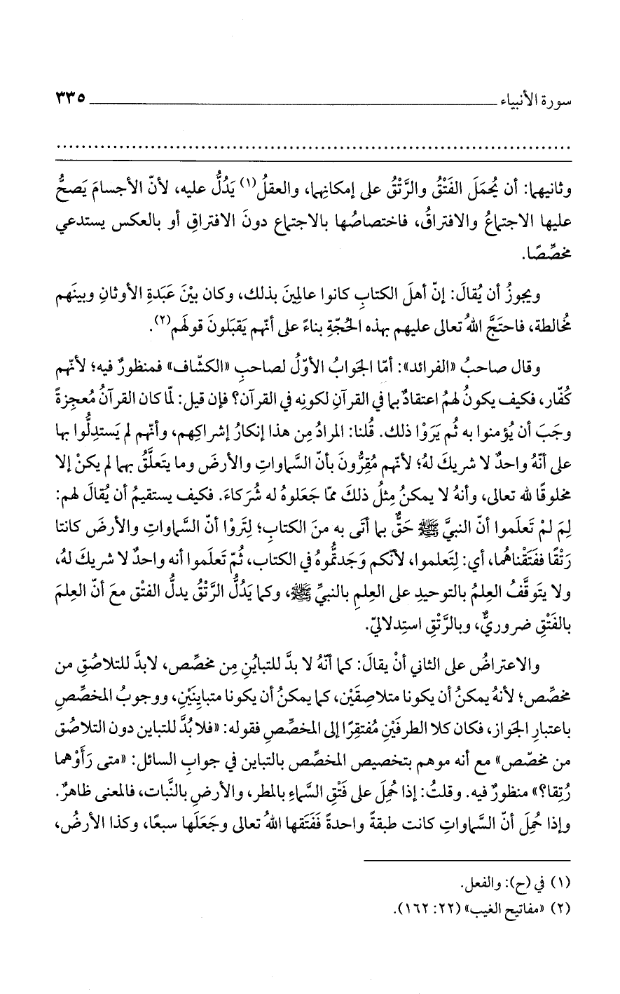 والاعتراضُ على الثاني أن يقال: كما أنه لابد للتباين من مخصص، لابد للتلاصق من مخصص؛ لأنه يمكن أن يكون متلاصقين، كما يمكن أن يكونا متباينين، ووجوب المخصص باعتبار الجواز، فكان لا الطرفين مفتقراً إلى المخصص فقوله: "فلابد للتباين دون التلاصق من مخصص" مع أنه موهم بتخصيص المخصص بالتباين في جواب السائل: "متى رأوهما رُتِقا؟ " منظورٌ فيه. وقلتُ: إذا حُمل على فتق السماء بالمطر، والأرض بالنبات، فالمعنى ظاهرٌ. وإذا حُمل أن السماوات كانت طبقةً واحدة ففتقها الله تعالى وجعلها سبعاً، وكذا الأرض،