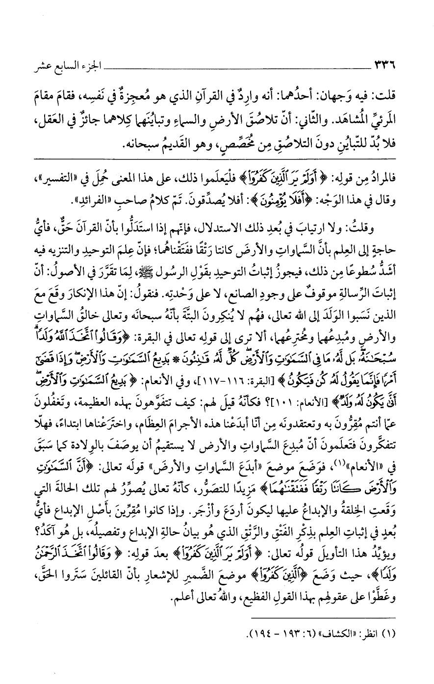 وقلتُ: ولا ارتياب في بُعد ذلك الاستدلال، فنهم إذا استدلوا بأن القرآن حقٌّ، فأيُّ حاجة إلى العلم بأن السماوات والأرض كانتا رتقاً ففتقناهما؛ فإن علم التوحيد والتنزيه فيه أشد سطوعاً من ذلك، فيجوزُ إثبات التوحيد بقول الرسول صلى الله عليه وسلم، لما تقرر في الأصول: أن إثبات للرسالة موقوفٌ على وجود الصانع، لا على وحدته. فنقول: إن هذا الإنكار وقع مع الذين نسبوا الولد إلى الله تعالى، فهم لا ينكرون البتة بأنه سبحانه وتعالى خالقُ السماوات والأرض ومبدعهما ومخترعهما، ألا ترى إلى قوله تعالى في البقرة: (وَقَالُوا اتَّخَذَ اللَّهُ وَلَداً سُبْحَانَهُ بَلْ لَهُ مَا فِي السَّمَوَاتِ وَالأَرْضِ كُلٌّ لَهُ قَانِتُونَ (116) بَدِيعُ السَّمَوَاتِ وَالأَرْضِ وَإِذَا قَضَى أَمْراً فَإِنَّمَا يَقُولُ لَهُ كُنْ فَيَكُونُ) [البقرة: 116 - 117]، وفي الأنعام: (بَدِيعُ السَّمَوَاتِ وَالأَرْضِ أَنَّى يَكُونُ لَهُ وَلَدٌ) [الأنعام: 101]؟ فكأنه قيل لهم: كيف تتفوهون بهذه العظيمة، وتغفلون عما أنتم مقرون به وتعتقدونه من أنا أبدعنا هذه الأجرام العظام، واخترعناها ابتداءً، فهلا تتفكرون فتعلمون أن مبدع السماوات والأرض لا يستقيم أن يوصف بالولادة كما سبق في "الأنعام"، فوضع موضع "أبدع السماوات والأرض" قوله تعالى: (أَنَّ السَّمَوَاتِ وَالأَرْضَ كَانَتَا رَتْقاً فَفَتَقْنَاهُمَا) مزيداً للتصور، أنه تعالى يصورُ لهم تلك الحالة التي وقعت الخلقةُ والإبداعُ عليها ليكون أردع وأزجر. وإذا كانوا مقرين بأصل الإبداع فأي بُعدٍ في إثبات العلم بذكر الفتق والرتق الذي هو بيان حالة الإبداع وتفصيلهن بل هو آكد؟ ويؤيد هذا التأويل قوله تعالى: (أَوَلَمْ يَرَى الَّذِينَ كَفَرُوا) بعد قوله: (وَقَالُوا اتَّخَذَ الرَّحْمَنُ وَلَداً)، حيث وضع (الَّذِينَ كَفَرُوا) موضع الضمير للإشعار بأن القائلين ستروا الحق، وغطوا على عقولهم بهذا القول الفظيع، والله تعالى أعلم.