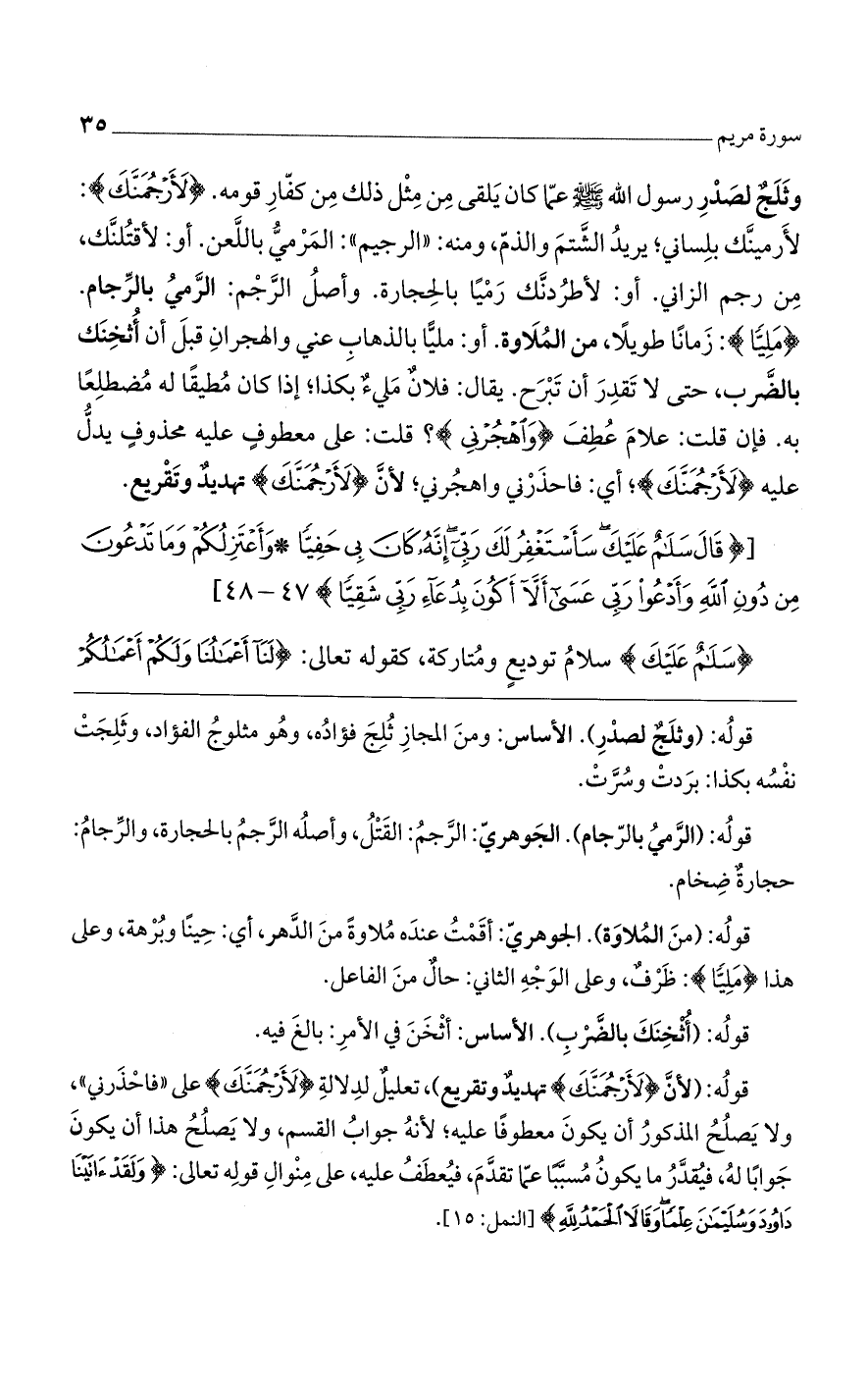 وثلج لصدر رسول الله صلى الله عليه وسلم عما كان يلقى من مثل ذلك من كفار قومه (لَأَرْجُمَنَّكَ) لأرمينك بلساني؛ يريد الشتم والذمّ، ومنه: "الرَّجِيمِ" المرمىّ باللعن. أو: لأقتُلنَّك، من رجم الزاني. أو: لأطردنك رميا بالحجارة. وأصل الرجم: الرمي بالرجام (مَلِيًّا) زمانا طويلاً، من الملاوة. أو: مليا بالذهاب عنى والهجران قبل أن أثخنك بالضرب، حتى لا تقدر أن تبرح. يقال: فلان ملىّ بكذا، إذا كان مطيقا له مضطلعا به. فإن قلت: علام عطف (وَاهْجُرْنِي)؟ قلت: على معطوف عليه محذوف يدل عليه (لَأَرْجُمَنَّكَ) أى فاحذرنى واهجرني، لأن (لَأَرْجُمَنَّكَ) تهديد وتقريع.