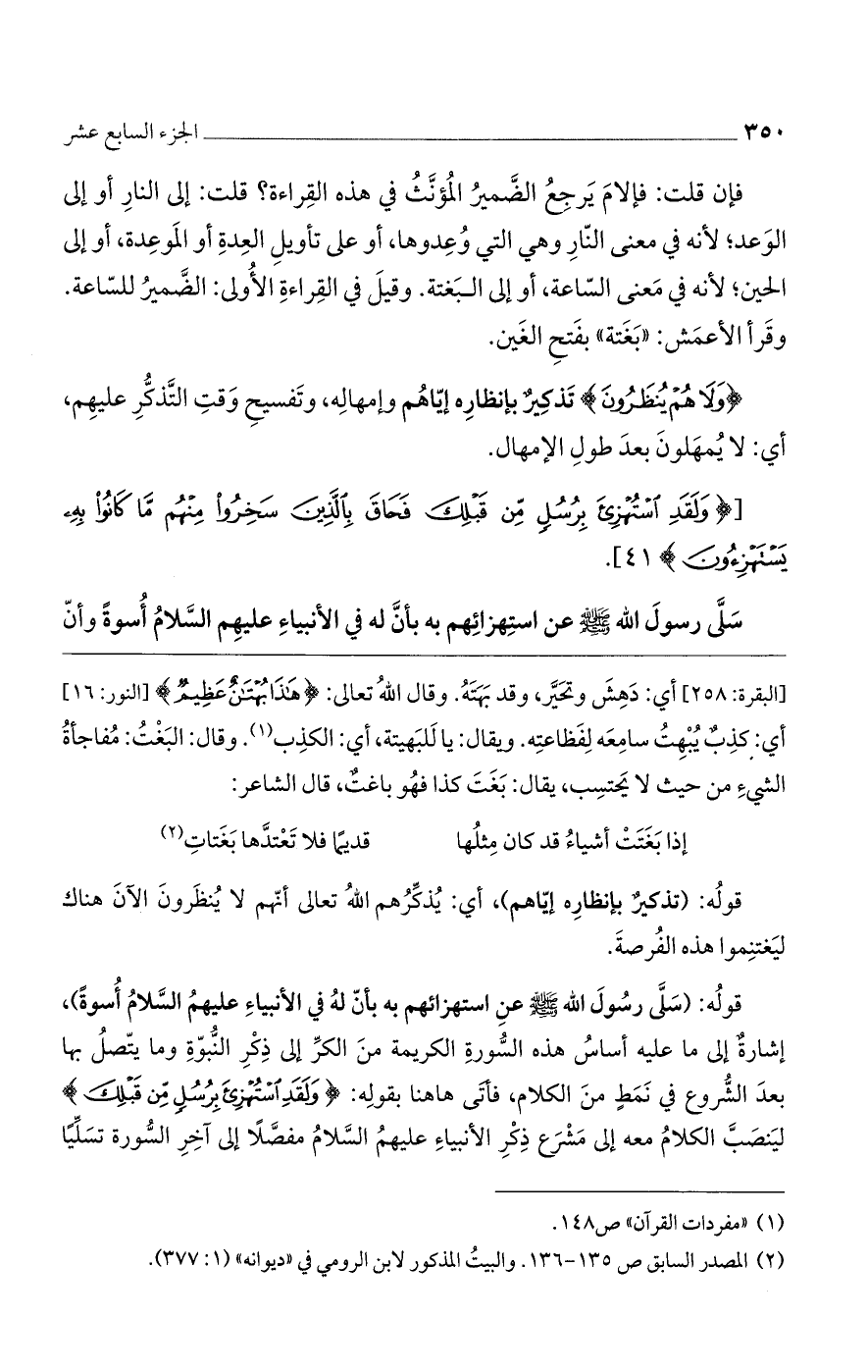فإن قلت: فإلام يرجع الضمير المؤنث في هذه القراءة؟ قلت: إلى النار أو إلى الوعد، لأنه في معنى النار وهي التي وعدوها أو على تأويل العدة أو الموعدة. أو إلى الحين، لأنه في معنى الساعة. أو إلى البغتة. وقيل في القراءة الأولى: الضمير للساعة. وقرأ الأعمش: بغتة، بفتح الغين.