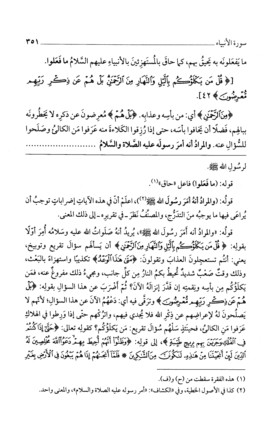 قوله: "والمرادُ أنه أمر رسول الله صلى الله عليه وسلم"، يريد أنه صلوات الله عليه وسلامه أُمر أولاً بقوله: (قُلْ مَنْ يَكْلَؤُكُمْ بِاللَّيْلِ وَالنَّهَارِ مِنْ الرَّحْمَنِ) أن يسألهم سؤال تقريع وتوبيخ، يعني: أنتم تستعجلون العذاب وتقولون: (مَتَى هَذَا الْوَعْدُ) تكذيباً واستهزاءً بالبعث، وذلك وقتٌ صعبٌ شديدٌ تحيطُ بكم النارُ من كل جانب، ومجيء ذلك مفروغٌ عنه، فمن يكلؤكم من بأسه ونقمته إن قدر إنزاله الآن؟ ثم أضربَ عن هذا السؤال بقوله: (بَلْ هُمْ عَنْ ذِكْرِ رَبِّهِمْ مُعْرِضُونَ) وترقى فيه أي: دعهمُ الآن عن هذا السؤال؛ لأنهم لا يصلحون له لإعراضهم عن ذكر الله فلا يُجدي فيهم، واتركهم حتى إذا ورطوا في الهلاك عرفوا من الكالئ، فحينئذ سلهم سُؤال تقريع: من يكلؤكم؟ كقوله تعالى: (حَتَّى إِذَا كُنْتُمْ فِي الْفُلْكِ وَجَرَيْنَ بِهِمْ بِرِيحٍ طَيِّبَةٍ)، إلى قوله: (وَظَنُّوا أَنَّهُمْ أُحِيطَ بِهِمْ دَعَوْا اللَّهَ مُخْلِصِينَ لَهُ الدِّينَ لَئِنْ أَنْجَيْتَنَا مِنْ هَذِهِ لَنَكُونَنَّ مِنْ الشَّاكِرِينَ * فَلَمَّا أَنْجَاهُمْ إِذَا هُمْ يَبْغُونَ فِي الأَرْضِ بِغَيْرِ