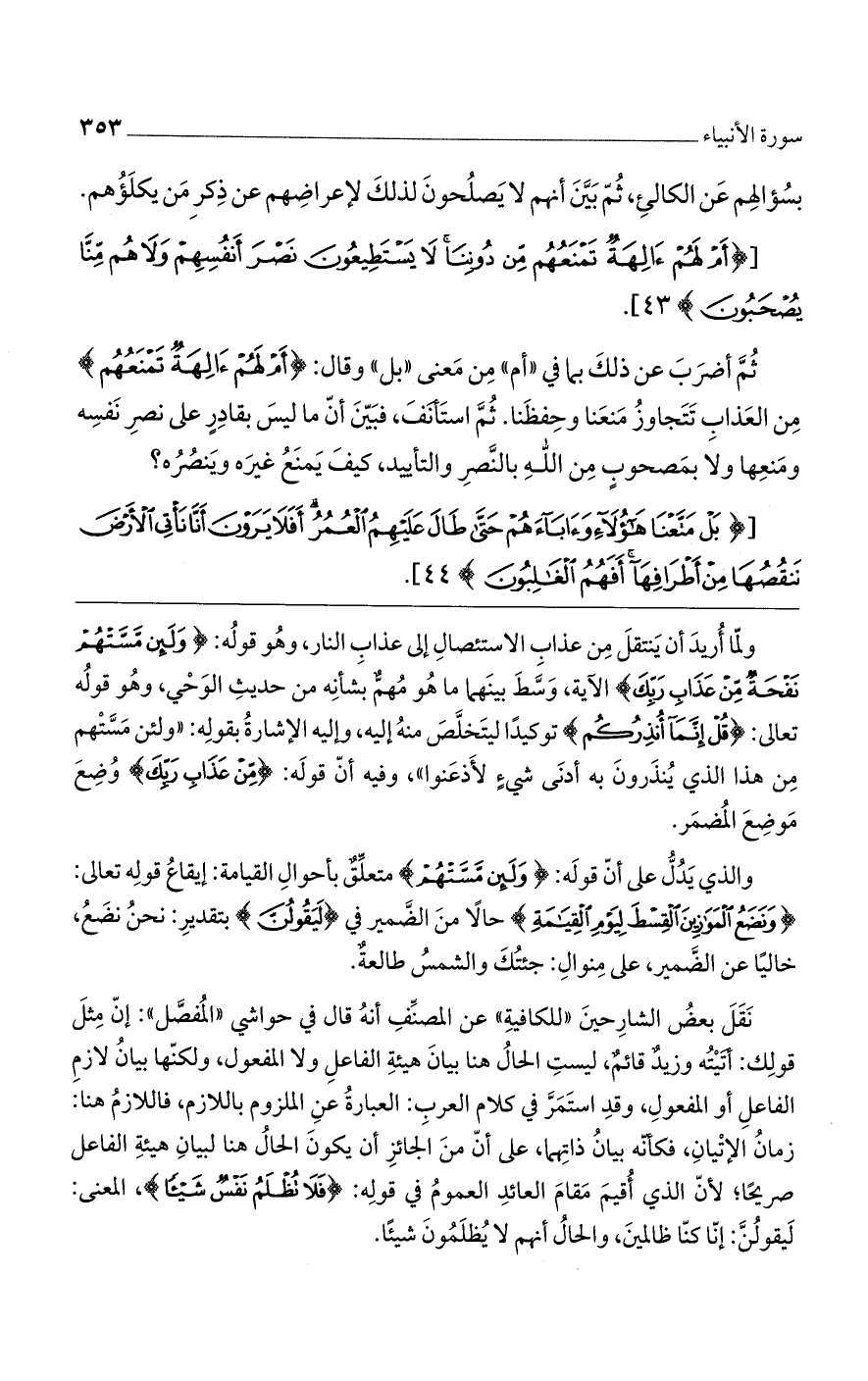نقلَ بعضُ الشارحين "للكافيةِ" عن المصنفِ أنه قال في حواشي "المفصل": إن مثل قولك: أتيته وزيدٌ قائمٌ، ليست الحالُ هنا بيان هيئة الفاعل ولا المفعول، ولكنها بيانُ لازم الفاعل أو المفعول، وقد استمر في كلام العرب: العبارةُ عن الملزوم باللازم، فاللازمُ هنا: زمانُ الإتيان، فكأنه بيان ذاتهما، على أن من الجائز أن يكون الحالُ هنا لبيان هيئة الفاعل صريحاً؛ لأن الذي أقيم مقام العائد العمومُ في قوله: (فَلا تُظْلَمُ نَفْسٌ شَيْئاً)، المعنى: ليقولُنَّ: إن كنا ظالمين، الحالُ أنهم لا يُظلمون شيئاً.