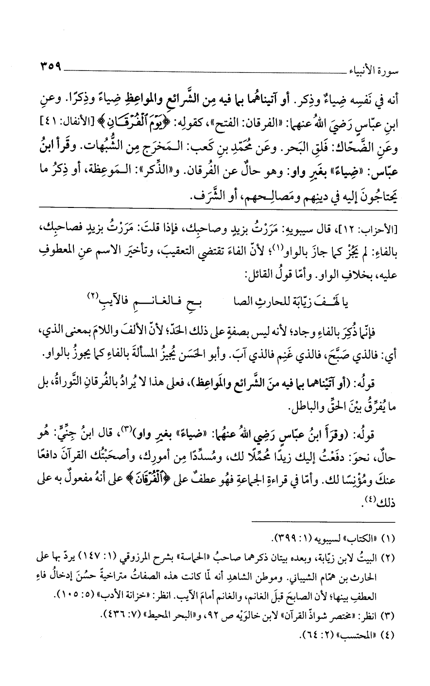 قوله: (وقرأ ابن عباس رضي الله عنهما: "ضياءً" بغير واو)، قال ابن جني: هو حالٌ، نحو: دفعتُ إليك زيداً محملاً لك، ومسدداً من أمورك، وأصبحتك القرآن دافعاً عنك ومؤنساً لك. وأما في قراءة الجماعة فهو عطفٌ على (الْفُرْقَانَ) على أنه مفعولٌ به على ذلك.