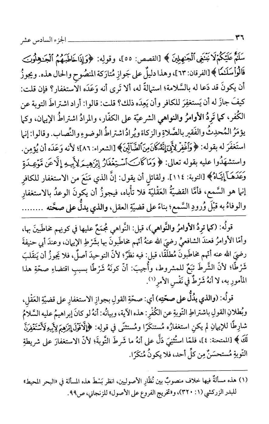 قالوا أراد اشتراط التوبة عن الكفر، كما ترد الأوامر والنواهي الشرعية على الكفار والمراد اشتراط الإيمان، وكما يؤمر المحدث والفقير بالصلاة والزكاة ويراد اشتراط الوضوء والنصاب. وقالوا: إنما استغفر له بقوله: (وَاغْفِرْ لِأَبِي إِنَّهُ كانَ مِنَ الضَّالِّينَ) [الشعراء: 86]؛ لأنه وعده أن يؤمن. واستشهدوا عليه بقوله تعالى (وَما كانَ اسْتِغْفارُ إِبْراهِيمَ لِأَبِيهِ إِلَّا عَنْ مَوْعِدَةٍ وَعَدَها إِيَّاهُ) [التوبة: 114]. ولقائل أن يقول: إنّ الذي منع من الاستغفار للكافر إنما هو السمع، فأمّا القضية العقلية فلا تأباه، فيجوز أن يكون الوعد بالاستغفار والوفاء به قبل ورود السمع، بناء على قضية العقل، والذي يدل على صحته