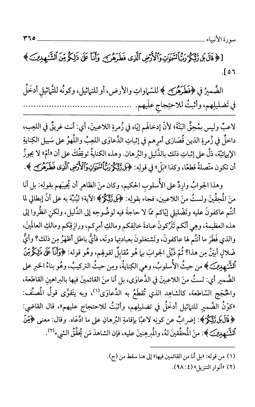 وهذا الجواب واردٌ على الأسلوب الحكيم، وكان من الظاهر أن يجيبهم بقوله: بل أنا من المحقين وليستُ من اللاعبين، فجاء بقوله: (بَل رَبُّكُمْ) الآية؛ لينبه به على أن إبطالي لما أنتم عاكفون عليه وتضليلي إياكم مما لاحاجة فيه لوضوحه إلى الدليل، ولكن انظروا إلى هذه العظيمة، وهي أنكم تتركون عبادة خالقكم ومالك أمركم، ورازقكم ومالك العالمين، والذي فطر ما أنتم لها عاكفون، وتشتغلون بعبادتها دون، فأي باطل أظهر من ذلك؟ وأي ضلال أبين من هذا؟ ثم ذيل الجواب بما هو مقابلٌ لقولهم، وهو قوله: (وَأَنَا عَلَى ذَلِكُمْ مِنْ الشَّاهِدِينَ) من حيث الأسلوب، وهي الكناية، ومن حيث التركيب، وهو بناء الخير على الضمير أي: لست من اللاعبين في الدعاوى، بل أنا من القائمين فيها بالبراهين القاطعة، والحجج الساطعة، كالشاهد الذي تُقطعُ به الدعاوى، وبه يتقوى قول المصنف: "كونُ الضمير للتماثيل أدخلُ في تضليلهم، وأثبتُ للاحتجاج عليهم"، قال القاضي: (قَالَ بَل رَبُّكُمْ): إضرابٌ عن كونه لاعباً بإقامة البرهان على ما ادعاه. وقال: معنى (مِنْ الشَّاهِدِينَ): من المحققين له، والمبرهنين عليه، فإن الشاهد من يحقق الشيء.
