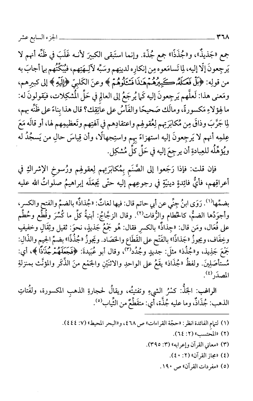 بضمها. روى ابن جني عن أبي حاتم قال: فيها لغاتٌ: "جُذاذٌ" بالضم والفتح والكسر، وأجودها الضمُّ، كالحطام والرفات. وقال الزجاج أبنيةُ كل ما كُسرَ وقُطع وحُطم على فُعال، ومن قال: "جِذاذٌ" بالكسر فقال: هو جمعُ جذيذ، نحو: ثقيل وثقالٍ وخفيفٍ وخفاف، ويجوزُ "جذاذاً" بالفتح على القطاع والحصاد. ويجوزُ "جُذُذاً" بضم الجيم والذال: جمع جذيذ، و"جُذُذ" مثل: جديدٍ وجُدُد، وقال أبو عبيدة: (فَجَعَلَهُمْ جُذَاذاً)، أي: مستأصلين. ولفظ "جُذاذ" يقعُ على الواحد والاثنين والجمع من الذكر والمؤني بمنزلة المصدر.