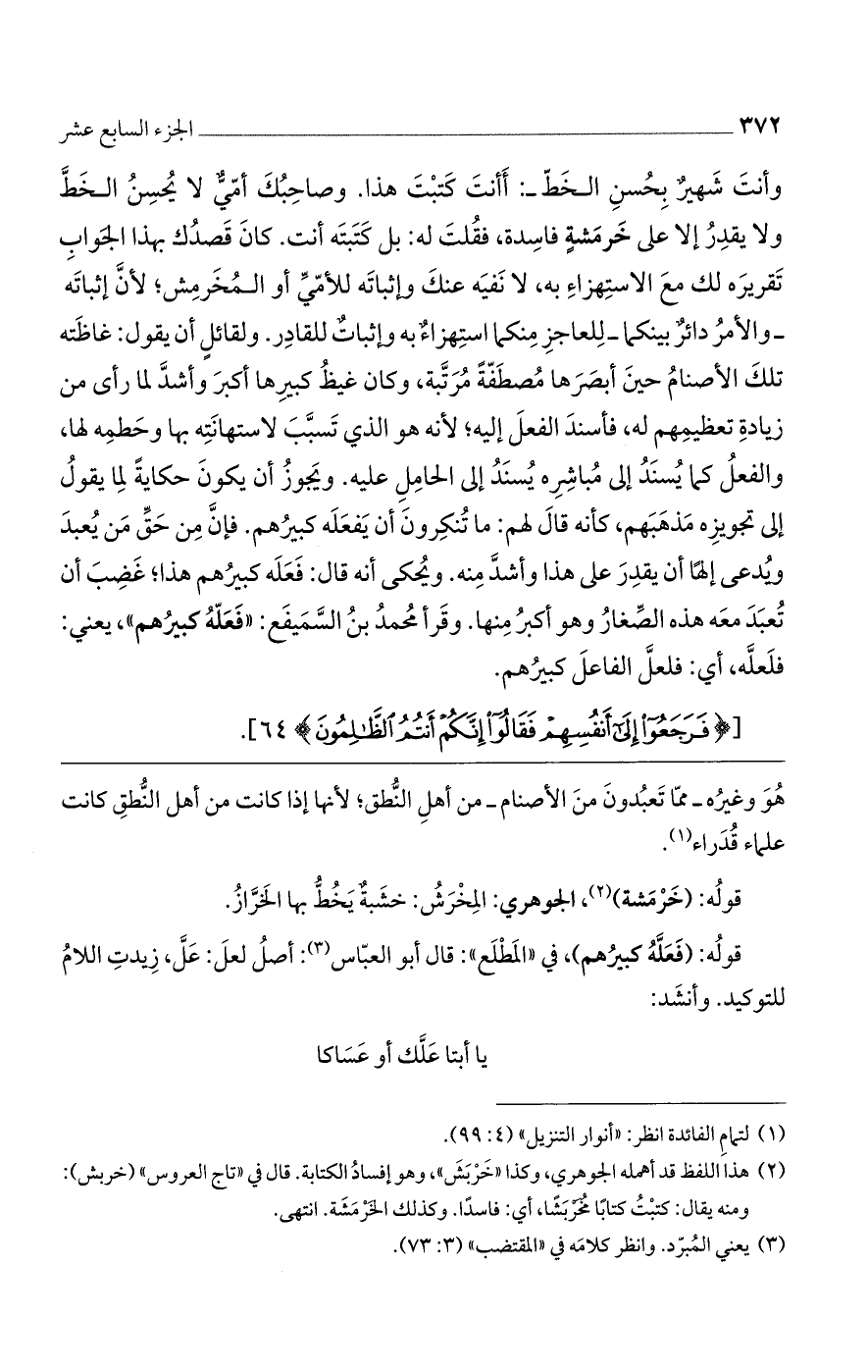 وأنت شهير بحسن الخط: أأنت كتبت هذا وصاحبك أمّىّ لا يحسن الخطّ ولا يقدر إلا على خرمشة فاسدة، فقلت له: بل كتبته أنت، كان قصدك بهذا الجواب تقريره لك مع الاستهزاء به، لا نفيه عنك وإثباته للأمّىّ أو المخرمش، لأنّ إثباته - والأمر دائر بينكما للعاجز منكما - استهزاء به وإثبات للقادر، ولقائل أن يقول: غاظته تلك الأصنام حين أبصرها مصطفة مرتبة، وكان غيظ كبيرها أكبر وأشدّ لما رأى من زيادة تعظيمهم له، فأسند الفعل إليه لأنه هو الذي تسبب لاستهانته بها وحطمه لها، والفعل كما يسند إلى مباشره يسند إلى الحامل عليه. ويجوز أن يكون حكاية لما يقول إلى تجويزه مذهبهم، كأنه قال لهم: ما تنكرون أن يفعله كبيرهم. فإنّ من حق من يعبد ويدعى إلها أن يقدر على هذا وأشدّ منه، ويحكى أنه قال: فعله كبيرهم هذا غضب أن تعبد معه هذه الصغار وهو أكبر منها. وقرأ محمد بن السميفع: "فعله كبيرهم"، يعني: فلعله، أى فلعلّ الفاعل كبيرهم.