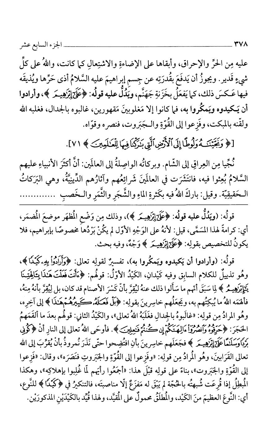 قوله: (وأرادوا أن يكيدوه ويمكروا به)، تفسيرٌ لقوله تعالى: (وَأَرَادُوا بِهِ كَيْداً)، وهو تذييلٌ للكلام السابق وفيه كيدان، الكيدُ الأول: قولهم: (أَأَنْتَ فَعَلْتَ هَذَا بِآلِهَتِنَا يَا إِبْرَاهِيمُ) لما سبق أنهم ما سألوا ذلك عنه ليُقر بأن كسر الأصنام قد كان، بل ليُقر بأنه منه، فألهمه الله ما يبكتهم به، ويجعلهم خاسرين بقوله: (بَلْ فَعَلَهُ كَبِيرُهُمْ هَذَا) إلى آخره، وهو المراد من قوله: "غالبوه بالجدال فغلبه الله تعالى"، والكيدُ الثاني: قولهم بعد ما ألقمهم الحجر: (حَرِّقُوهُ وَانصُرُوا آلِهَتَكُمْ إِنْ كُنتُمْ فَاعِلِينَ). فأوحى الله تعالى إلى النار أن (كُونِي بَرْداً وَسَلاماً عَلَى إِبْرَاهِيمَ) فجعلهم خاسرين بأن افتضحوا حتى نذر نُمروذُ بأن يُقرب إلى الله تعالى القرابين، وهو المراد من قوله: "وفزعوا إلى القوة والجبروت فنصره"، وقال: "فزعوا إلى القوة والجبروت"، بناءً على قول قبل هذا: "اجمعوا رأيهم لما غُلبوا بإهلاكه"، وهكذا المبطل إذا قُرعت شبهته بالحجة لم يبق له مفزعٌ إلا مناصبته، فالتنكير في (كَيْداً) للنوع، أي: النوع العظيم من الكيد، المطلقُ محمولٌ على المقيد، ولهذا قُيد بالكيدين المذكورين.