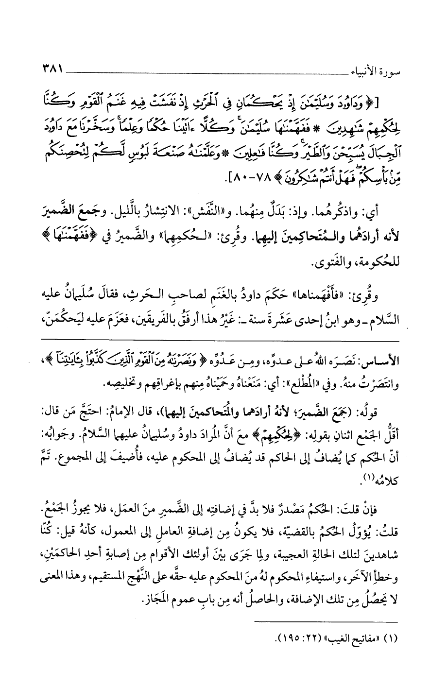قوله: (جمع الضمير؛ لأنه أرادهما والمتحاكمين إليهما)، قال الإمامُ: احتج من قال: أقلُّ الجمع اثنان بقوله: (لِحُكْمِهِمْ) مع أن المراد داود وسُليمان عليهما السلامُ. وجوابه: أن الحكم كما يُضاف إلى الحاكم قد يُضاف إلى المحكوم عليه، فأضيف إلى المجموع. تَمَّ كلامه.