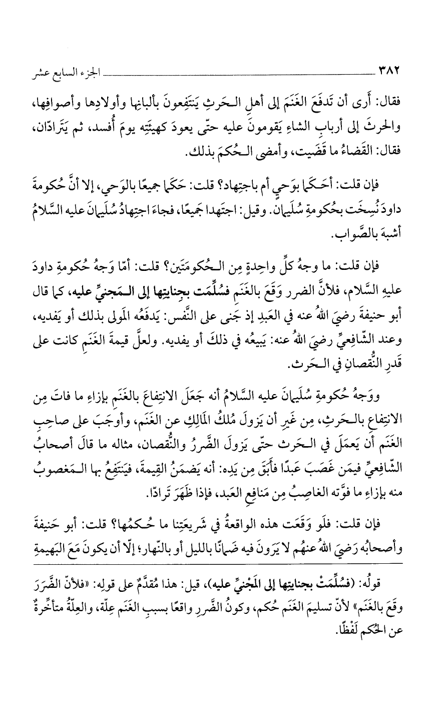 ووجه حكومة سليمان عليه السلام أنه جعل الانتفاع بالغنم بإزاء ما فات من الانتفاع بالحرث، من غير أن يزول ملك المالك عن الغنم، وأوجب على صاحب الغنم أن يعمل في الحرث حتى يزول الضرر والنقصان، مثاله ما قال أصحاب الشافعي فيمن غصب عبدا فأبق من يده: أنه يضمن القيمة فينتفع بها المغصوب منه بإزاء ما فوّته الغاصب من منافع العبد، فإذا ظهر ترادّا.